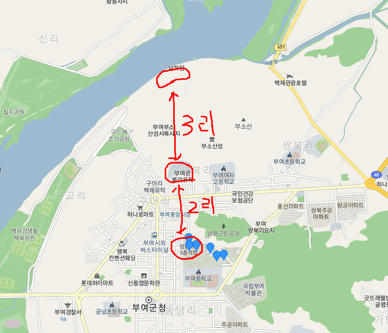 한데 유인원 기공비는 이 부여현치를 기준으로 북쪽 3리 지점에 위치한다 했다. 따라서 현치 북쪽 3리 지점은 대략 지도로 표시하면 저 정도가 된다. 다시 말해 낙화암 근방이 된다는 결론이 나온다. 하지만 낙화암에다가 비석을 세운다?
