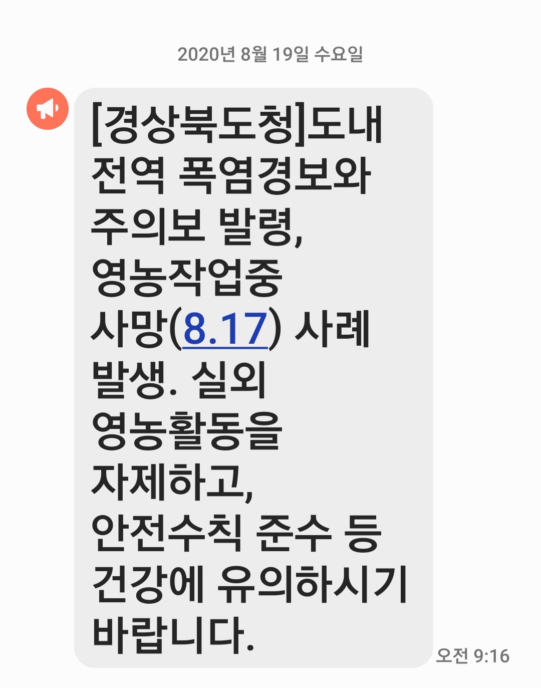 노인이 대부부인 농촌에서 요즘 같은 폭염에 한낮 야외 노동은 골로가기 십상이라 실제 어제 김천 어느 동네선 이런 일이 있었다는 알림이 김천시청에서 날아든다.