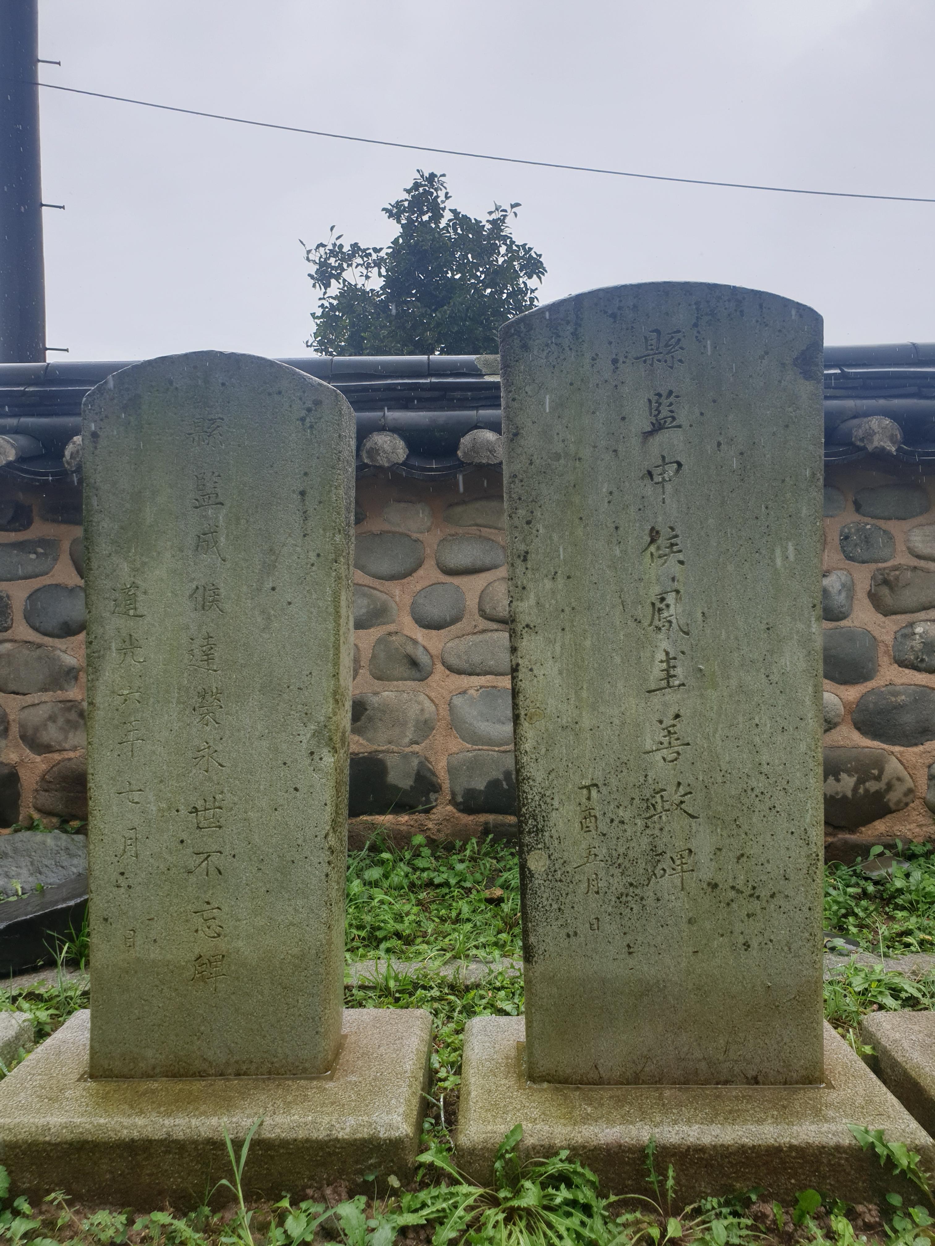 오른쪽 顯監申候鳳圭善政碑[현감 신봉규 선정비, 公에 해당하는 부분에 侯후 라는 글자를 쓰기도 하거니와, 저에 새긴 글자 모양으로 볼 적에는 候다. 두 글자는 흔히 혼용했다.]는 정유丁酉 5월에 세웠다고 하고 왼편 顯監成侯達榮永世不忘碑[현감 성달영 영세불망비]는 도광道光 6년 7월에 세웠다 했으니, 연표 찾아보니 도광 6년은 조선으로서는 순조純祖 26년이라, 곧 1826년이다.