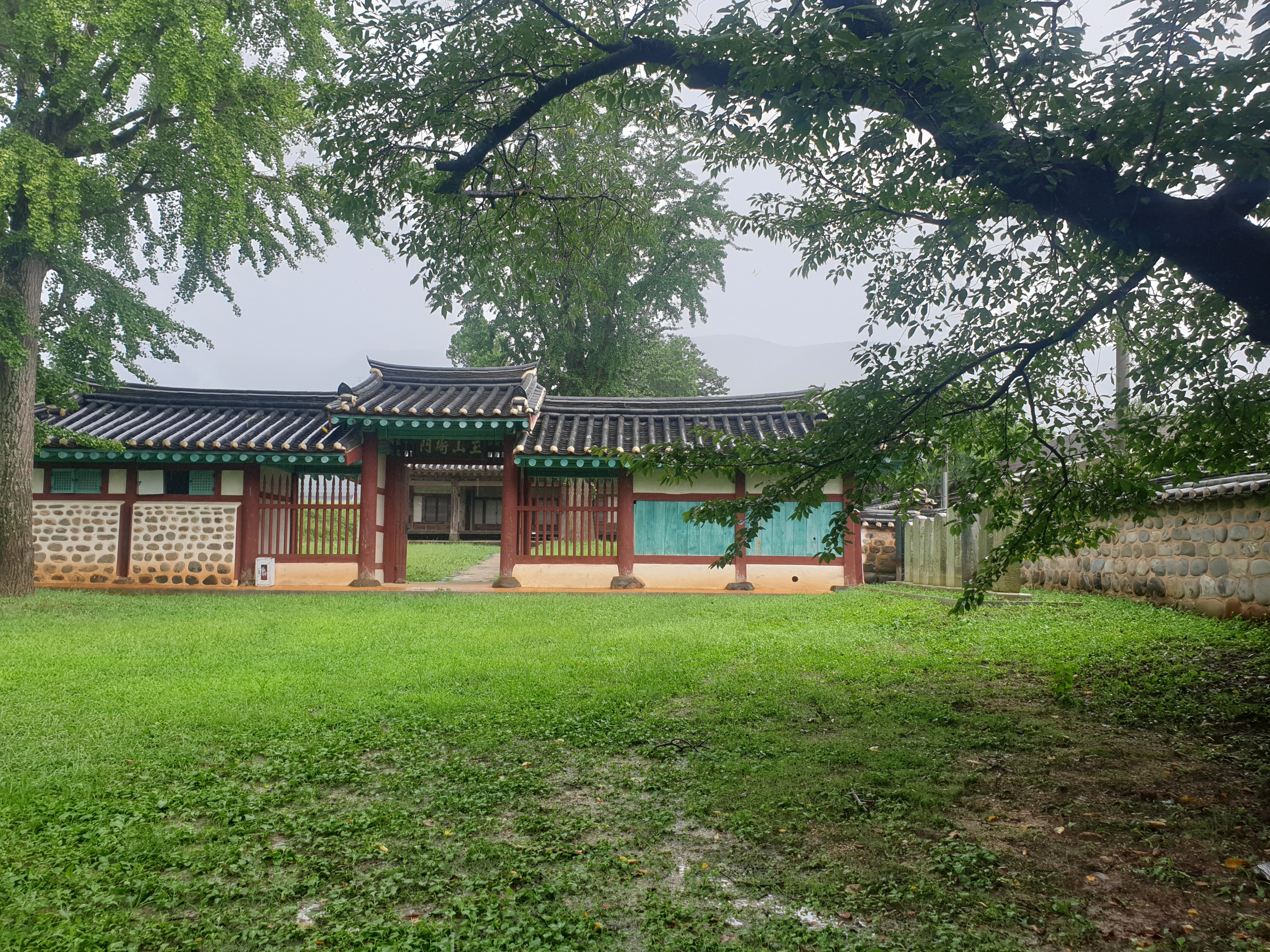 대문 들어서기 전 잠깐 뒤돌인 내가 겉은 뒤를 돌인보는데 저만치 진서루 물비 잔뜩 머금곤 처연히 섰다.