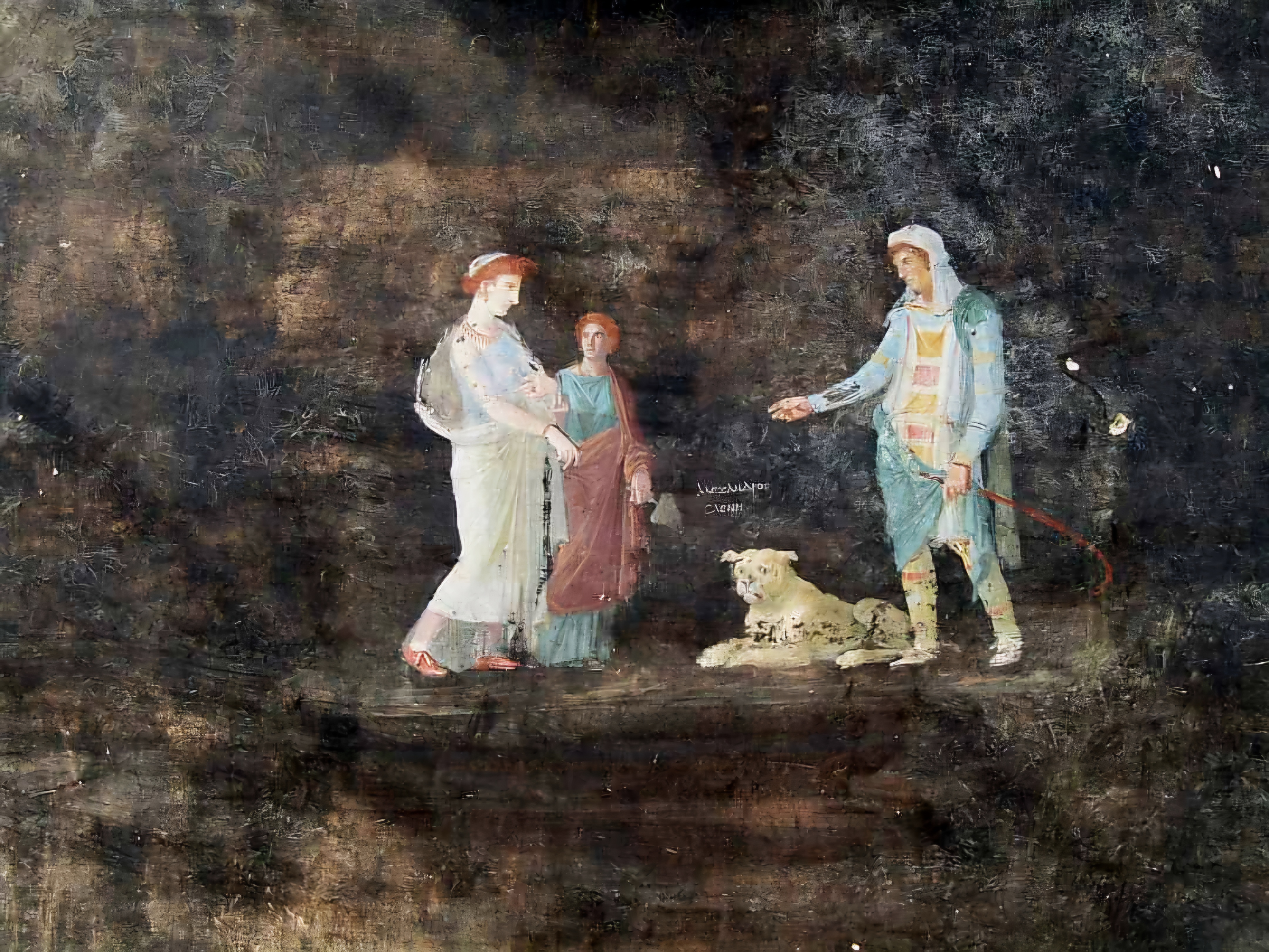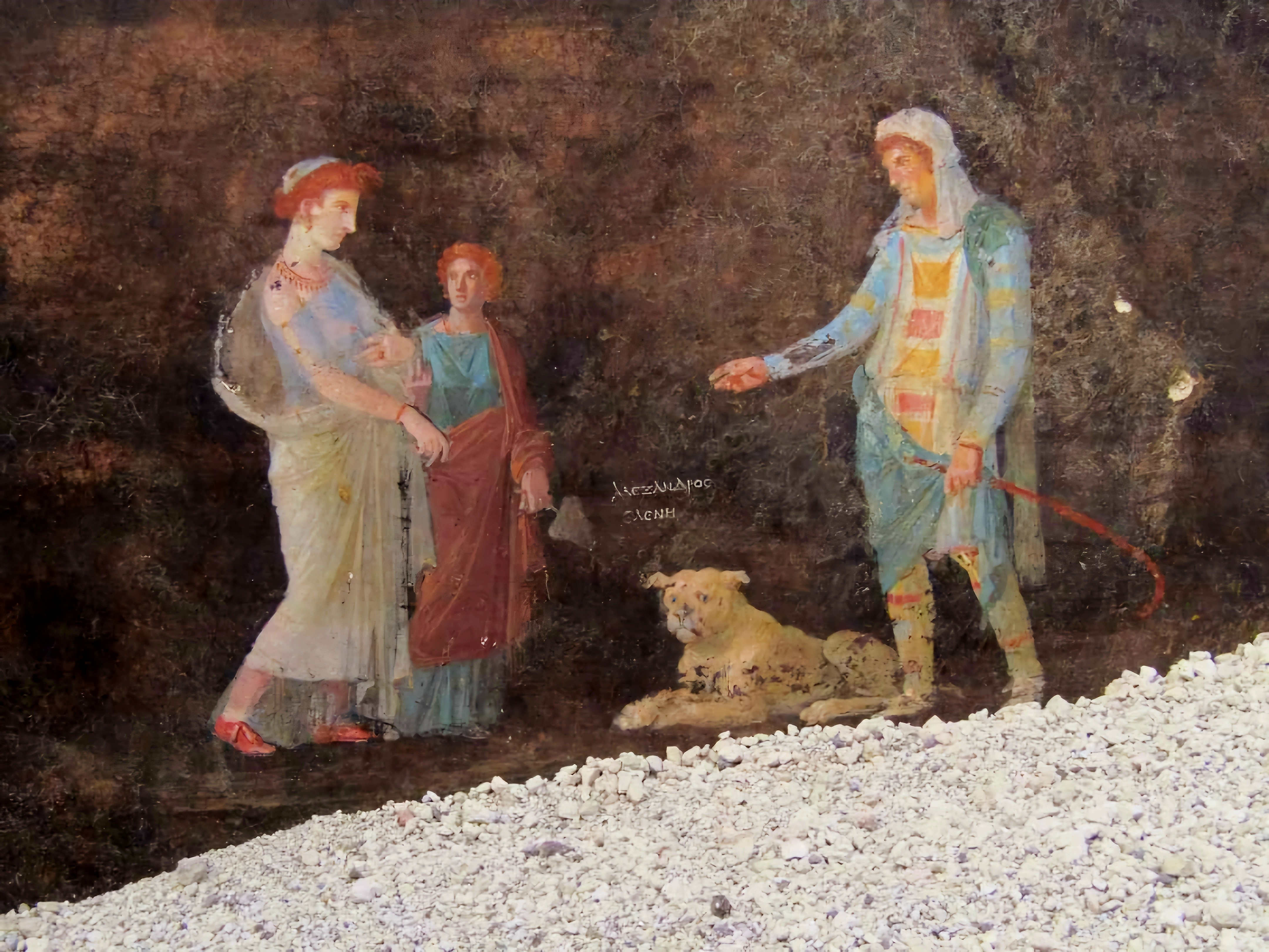 In addition to Helen and Paris, indicated in a Greek inscription between the two figures with his other name "Alexandros", the figure of Cassandra, daughter of Priam, paired with Apollo appears on the walls of the hall.