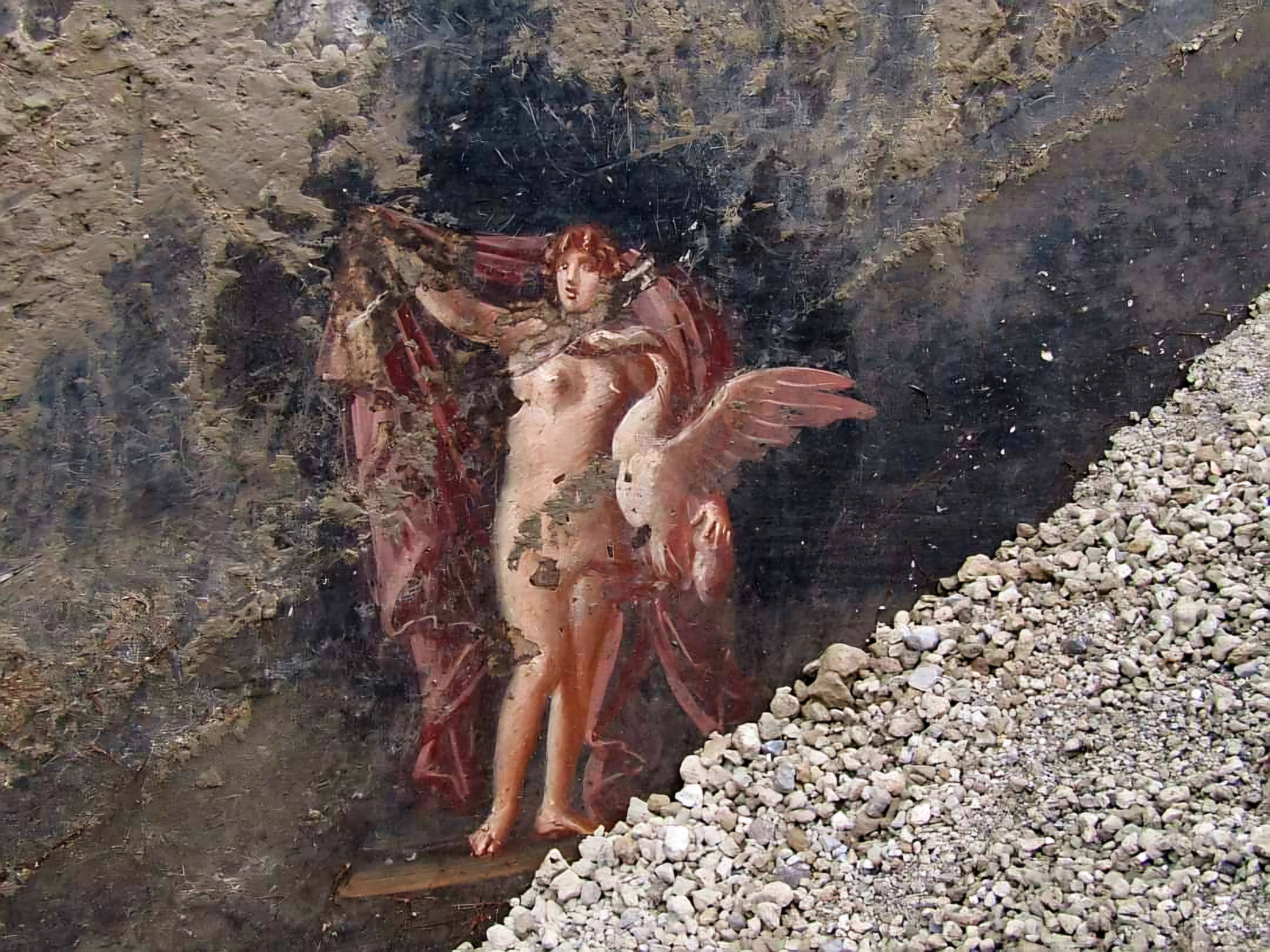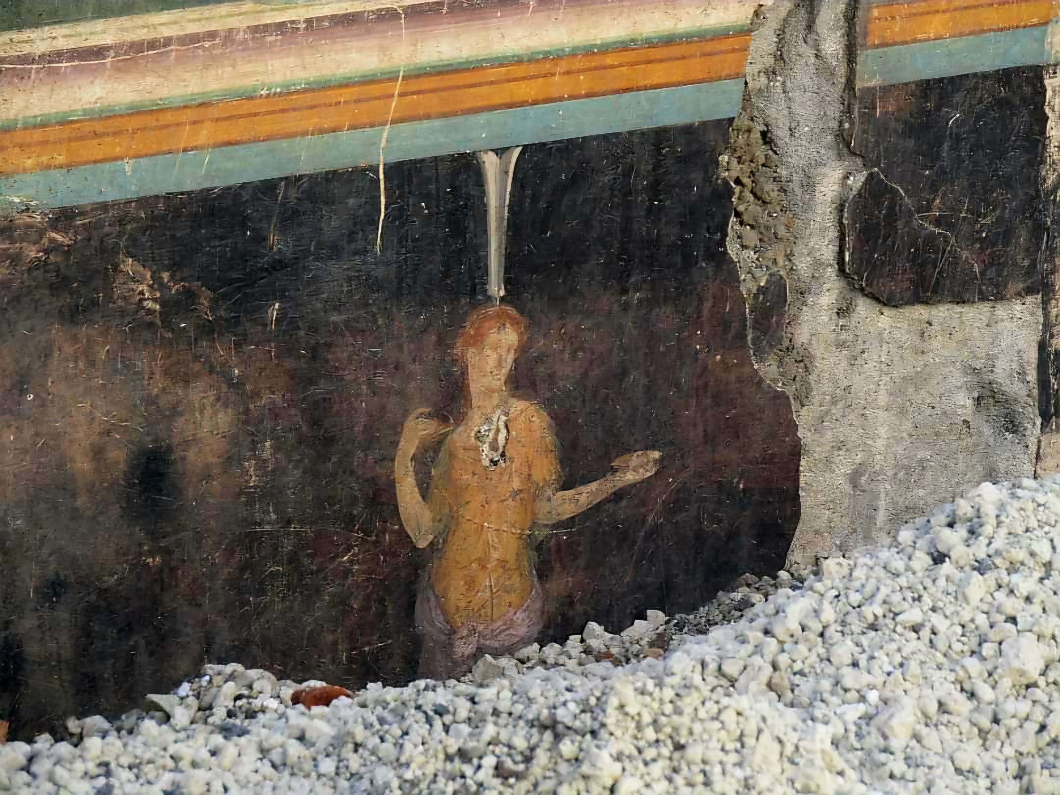 누군가가 거대한 계단 아치의 거친 회반죽 위에 숯으로 그림을 그렸고, 두 쌍의 검투사들과 거대한 양식화한 팔루스로 보인다.
