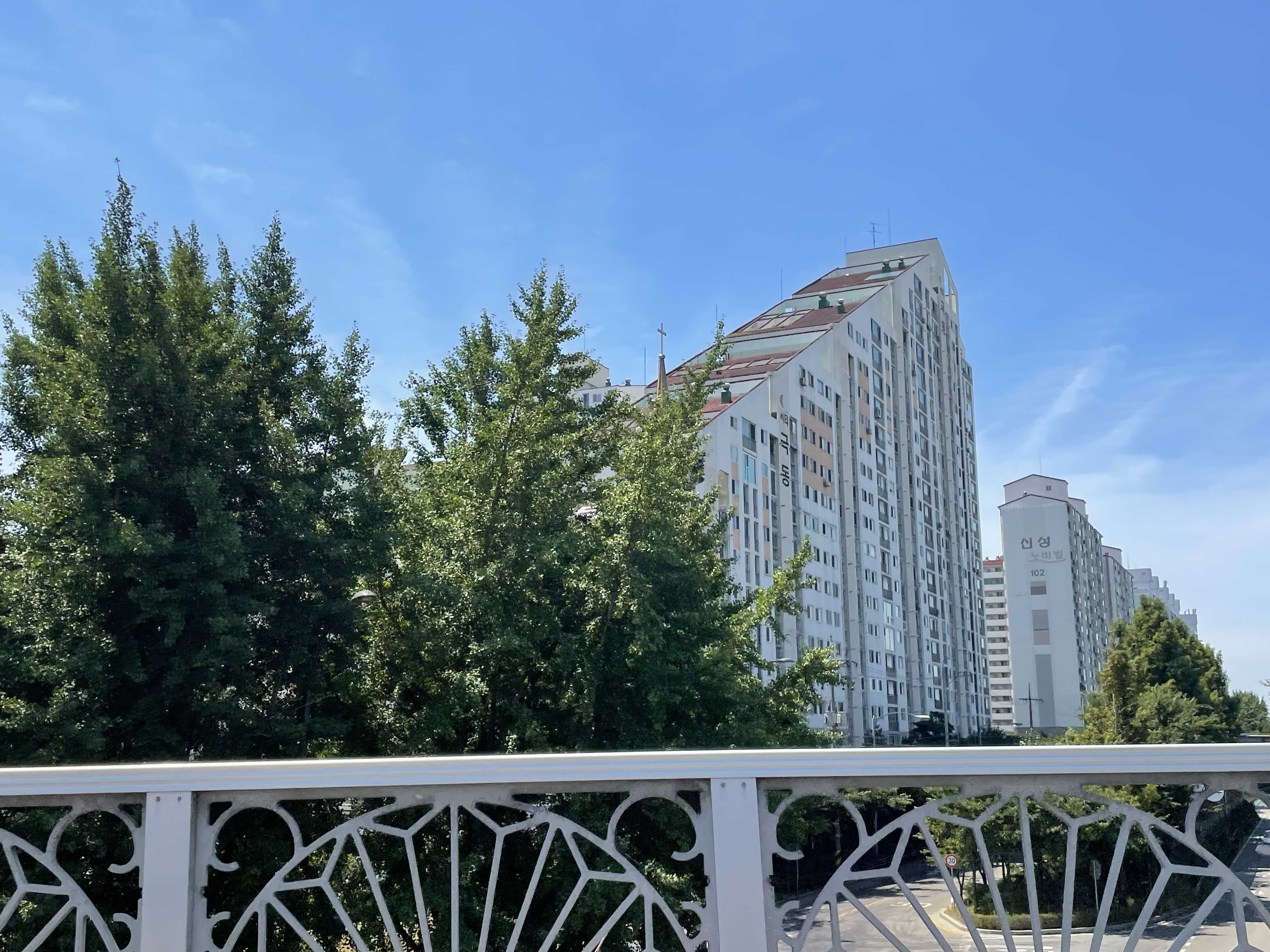 아파트 단지 사이에 교회 건물이 삐죽 솟아 있습니다.