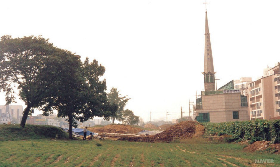 인터넷으로 검색하다, 1998년 풍납토성이 담긴 사진을 보았는데, 저 교회가 지금 아파트 사이로 삐죽 보이는 교회일까요.