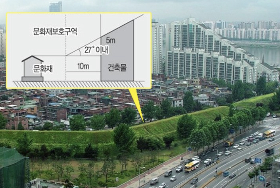 찾아보니 현행법상 문화재 보호구역 내에 들어서는 건축물은 경계 지표면에서 문화재 높이를 기준으로 높이가 제한되는데, 그 앙각이 27도 이내라고 합니다.