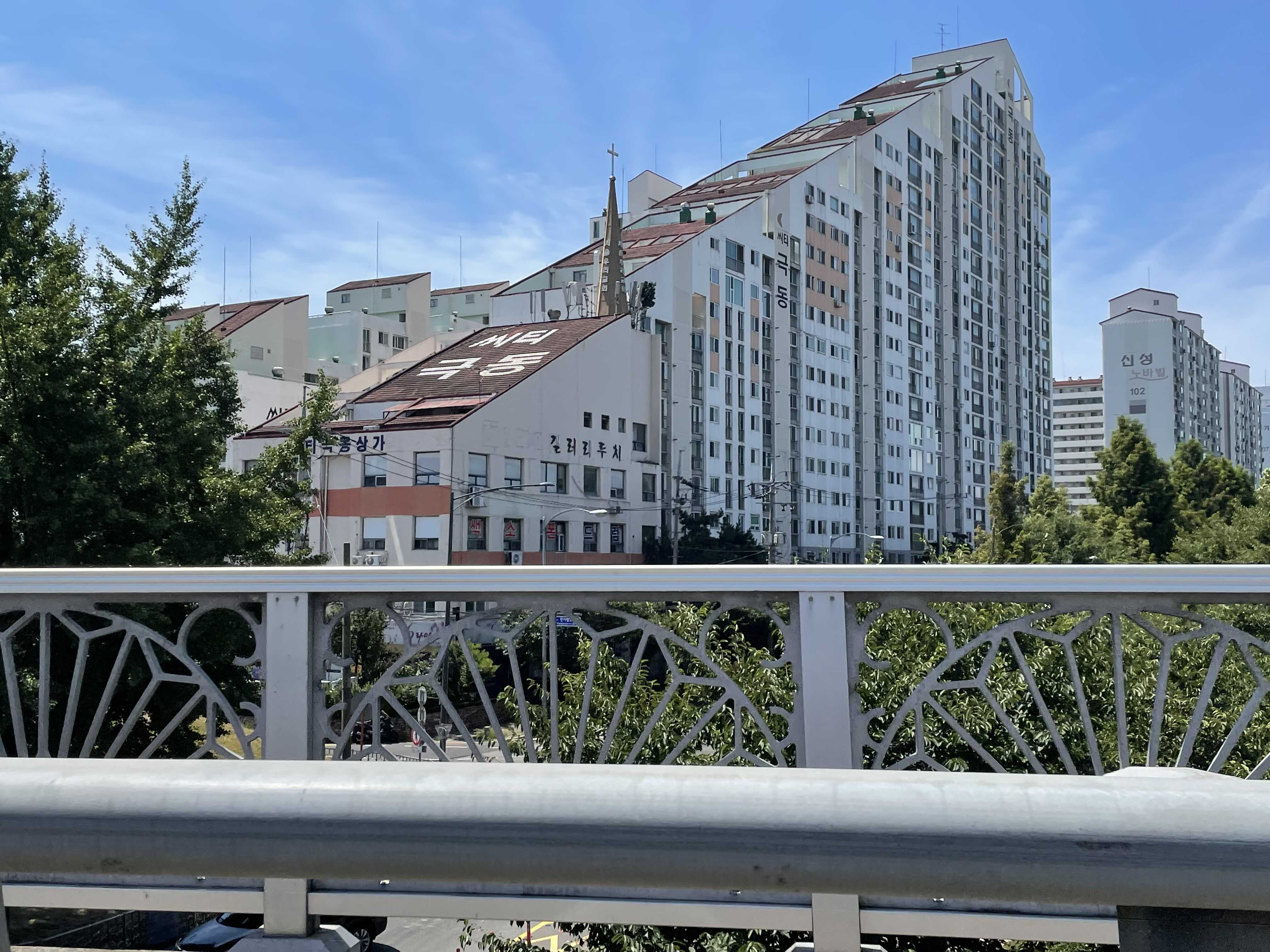 아파트 단지 사이에 교회 건물이 삐죽 솟아 있습니다.