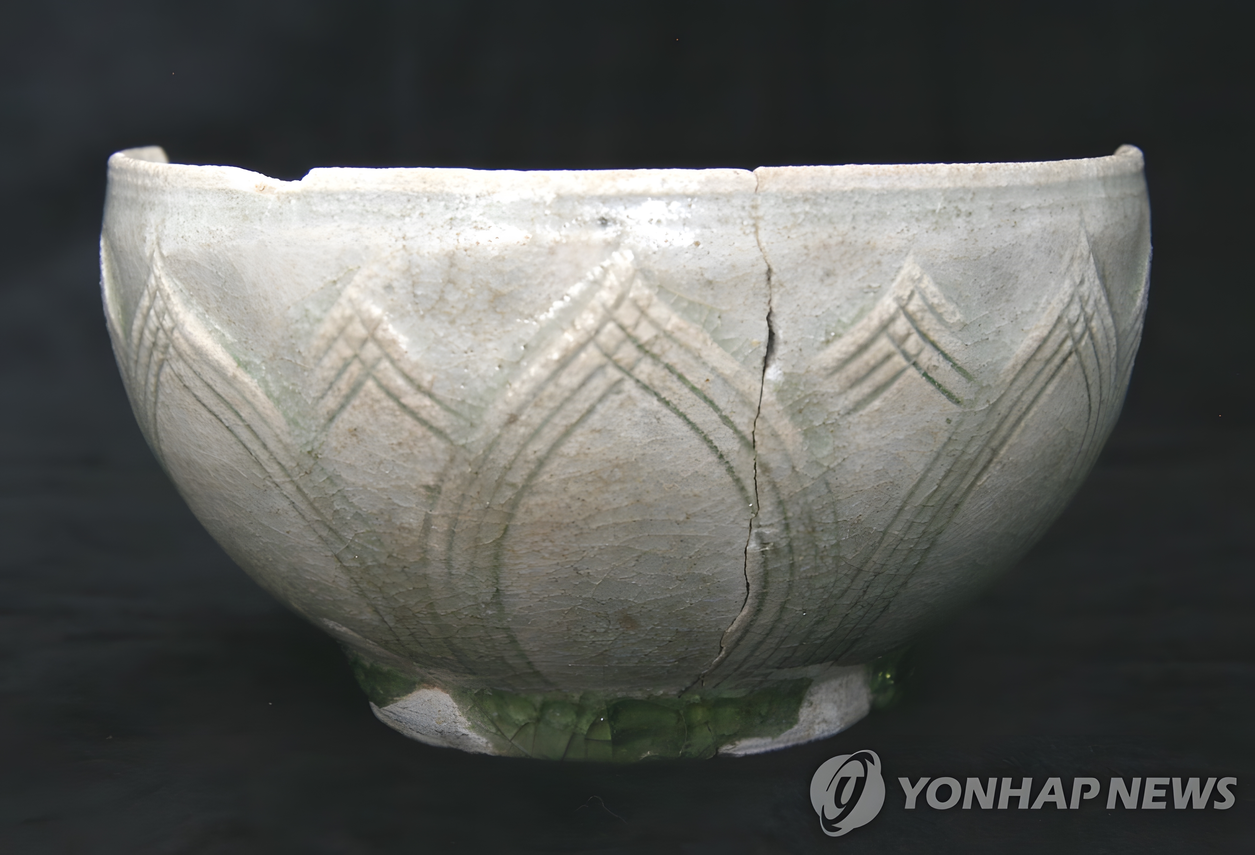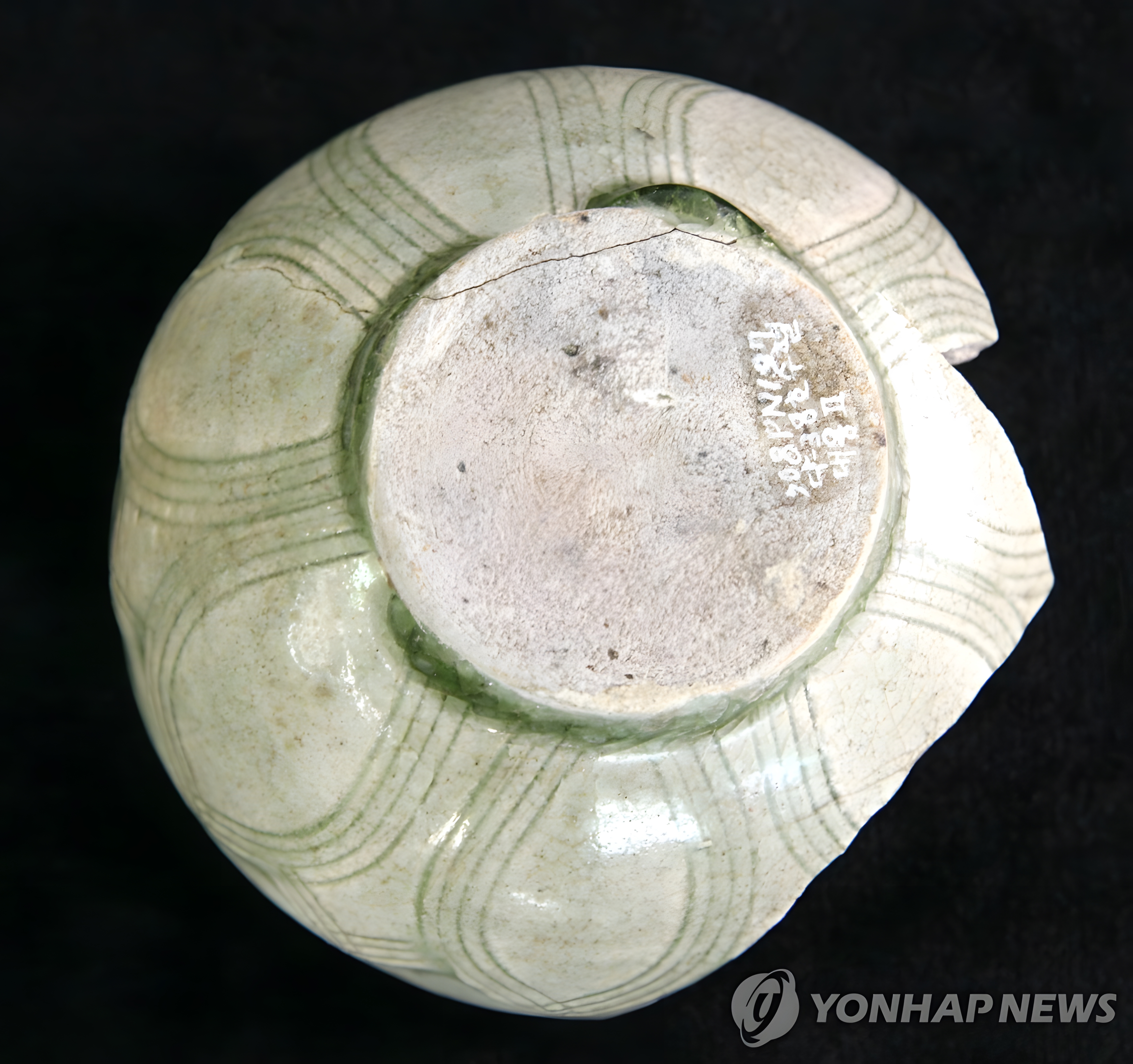 2008년 풍납토성 옛 미래마을 지구 발굴조사에서 국립문화재연구소(현 국립문화유산연구원)이 한성백제시대 대형 항아리(대옹) 속에서 발견한 중국제 청자 음양각 연판문靑磁陰陽刻蓮瓣文 사발 몸통 측면과 그 바닥 쪽 장면이다.