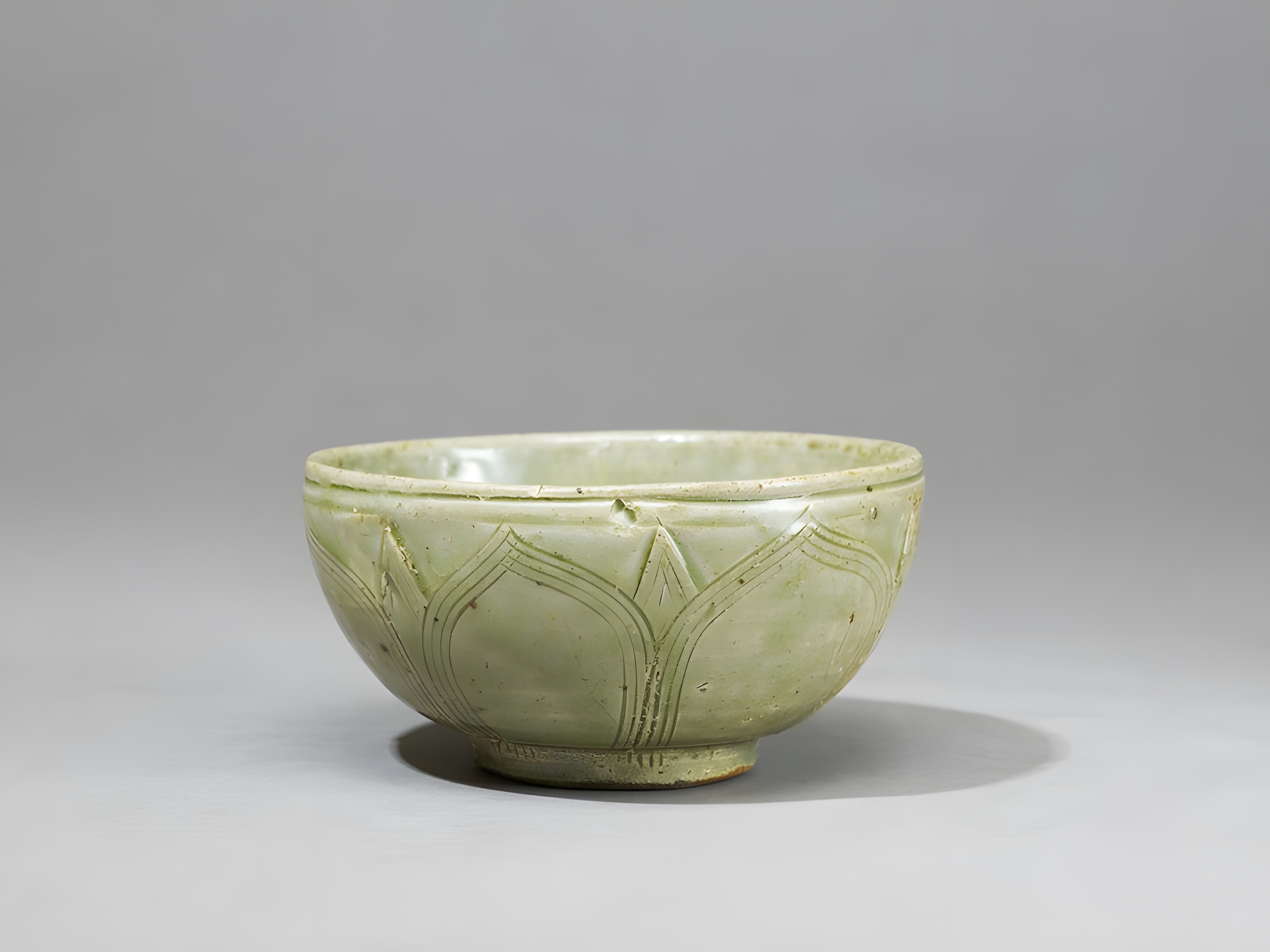 Material and techniquestoneware, with incised decoration under a green glaze; unglazed base; glazed rim