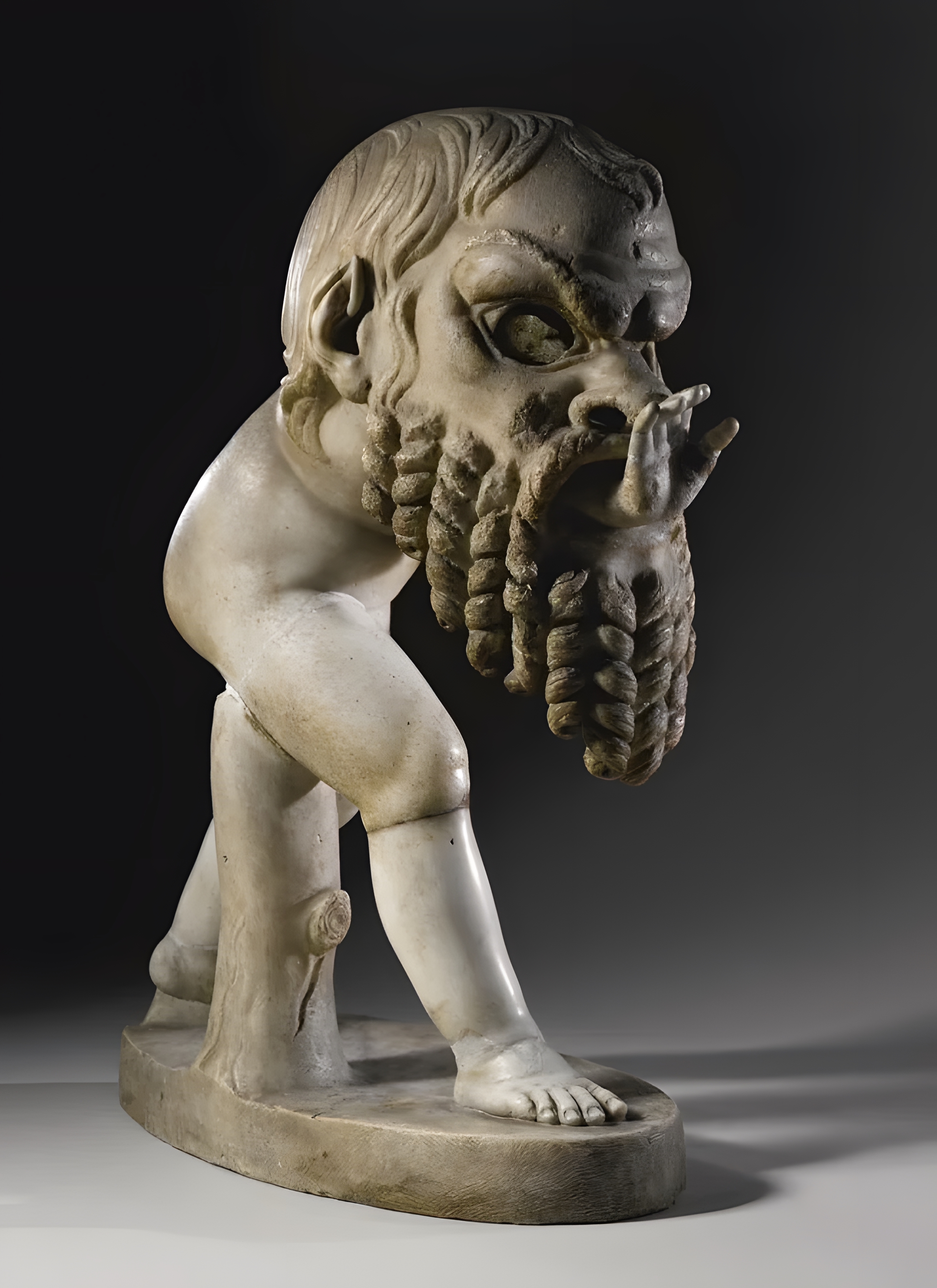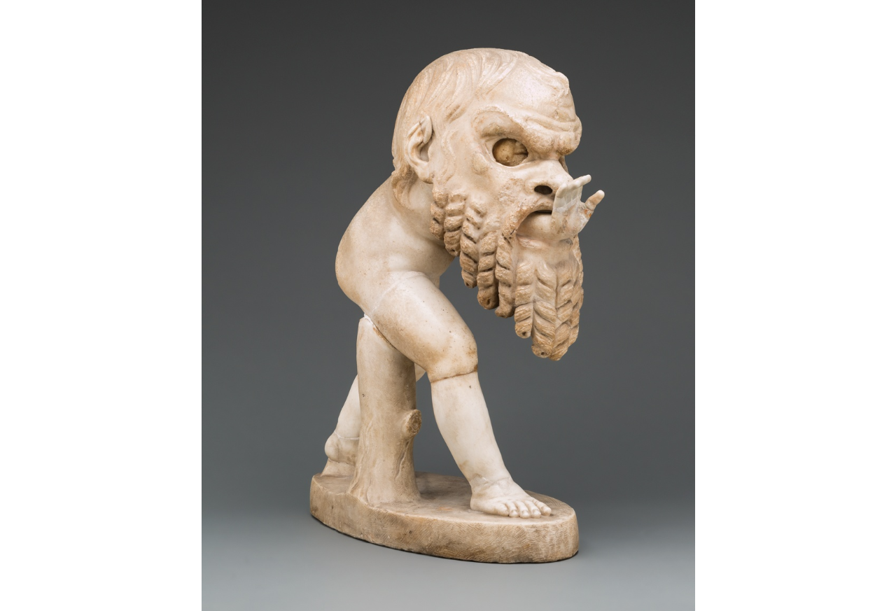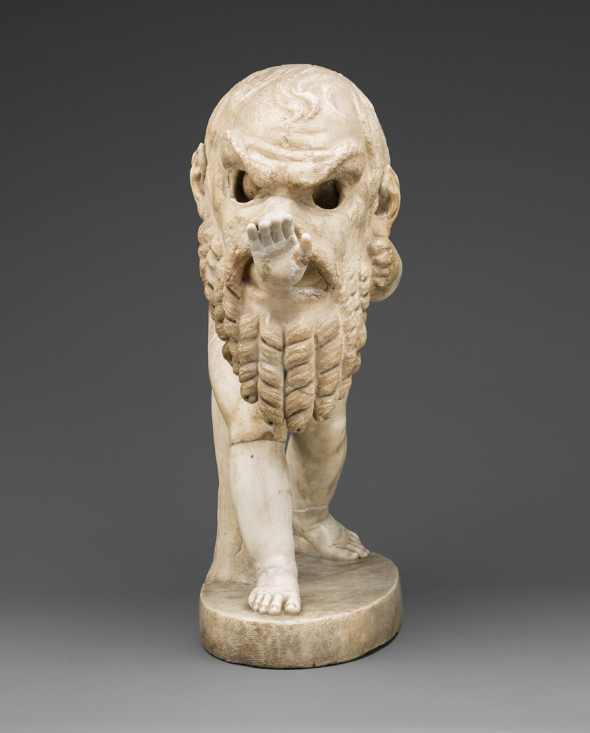 stepping forward menacingly, wearing over his head and shoulders an oversized comedy mask of an old satyr (Silenus), and thrusting his hand through the gaping mouth of the mask, the lower part of the child’s face and his grinning mouth visible through the eyes of the mask; the base, support, lower right leg, left leg, genitalia, left arm, both ears, and right hand restored in marble.