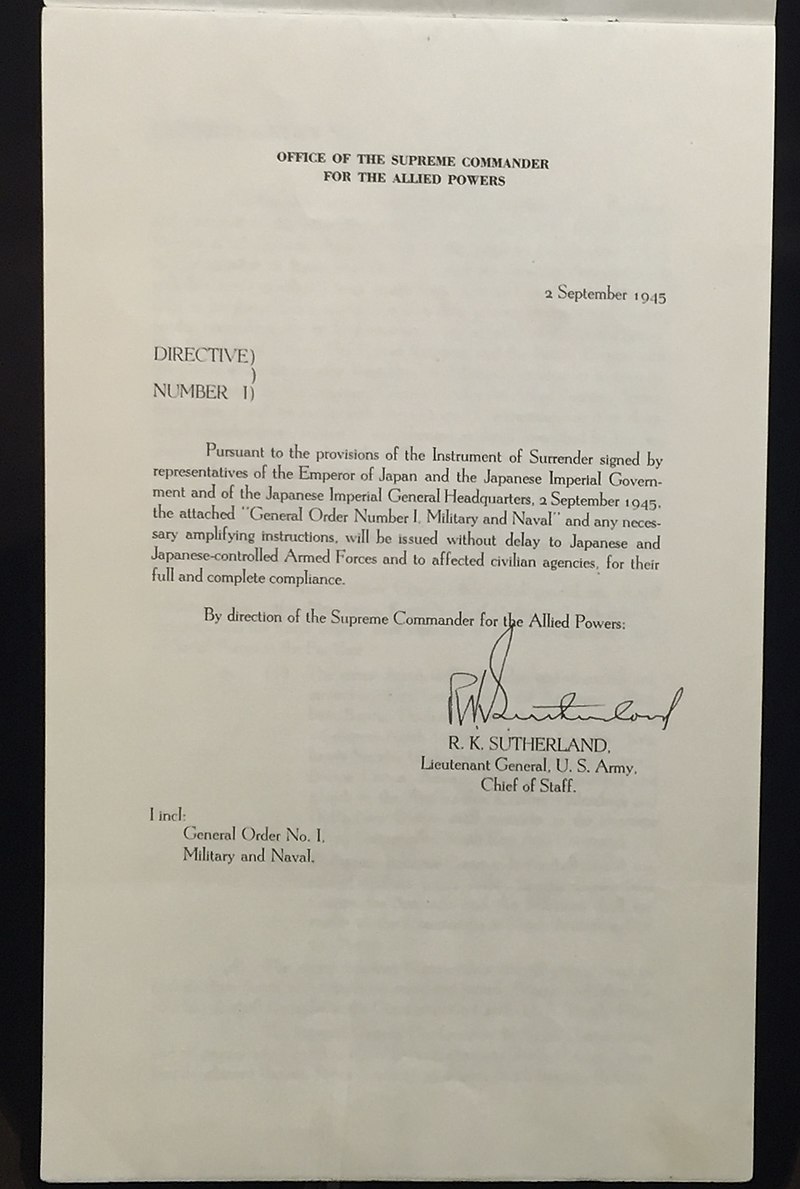 라 해서 1945년 9월 2일 일본 정부가 미주리함에서 항복문서에 조인과 동시에 연합군최고사령부 (GHQ) 명령 제1호로 일본군 육해군 해체 명령이 하달되었다는 말이다.