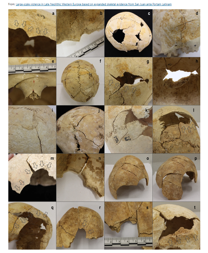논문 요약을 보건대. 오늘날 스페인 산후안테 포르탐 라티남 바위그늘(대략 3380–3000cal. BC)에서 출토한 인골을 다시금 잘 조사한 결과 검사는 치유되지 않은 외상 65건과 치유한 외상 89건을 찾아냈으니, 이 중 77건은 이전에는 찾아내지 못한 것이라고 한다. 한데 분석 결과 이들 외상은 공격성, 다시 말해 누군가한테 얻어텨져 생긴 것으로 확인했다는 것이다.
