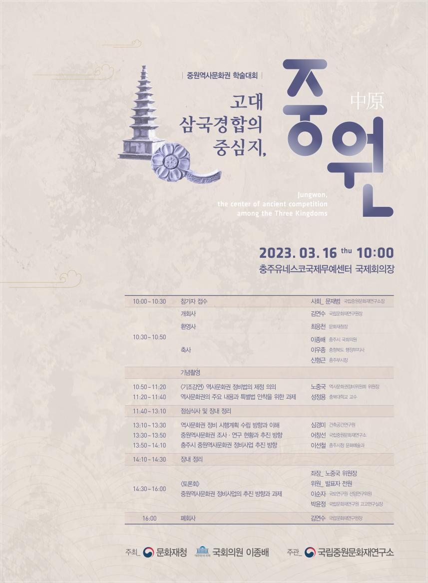 문화재청 국립문화재연구원 국립중원문화재연구소(소장 문재범)는 국회의원 이종배(충북 충주시)와 함께 오는 16일 오전 10시 충주 국제유네스코무예센터에서 ‘고대 삼국 경합의 중심지, 중원’을 주제로 학술대회를 공동 개최한다.