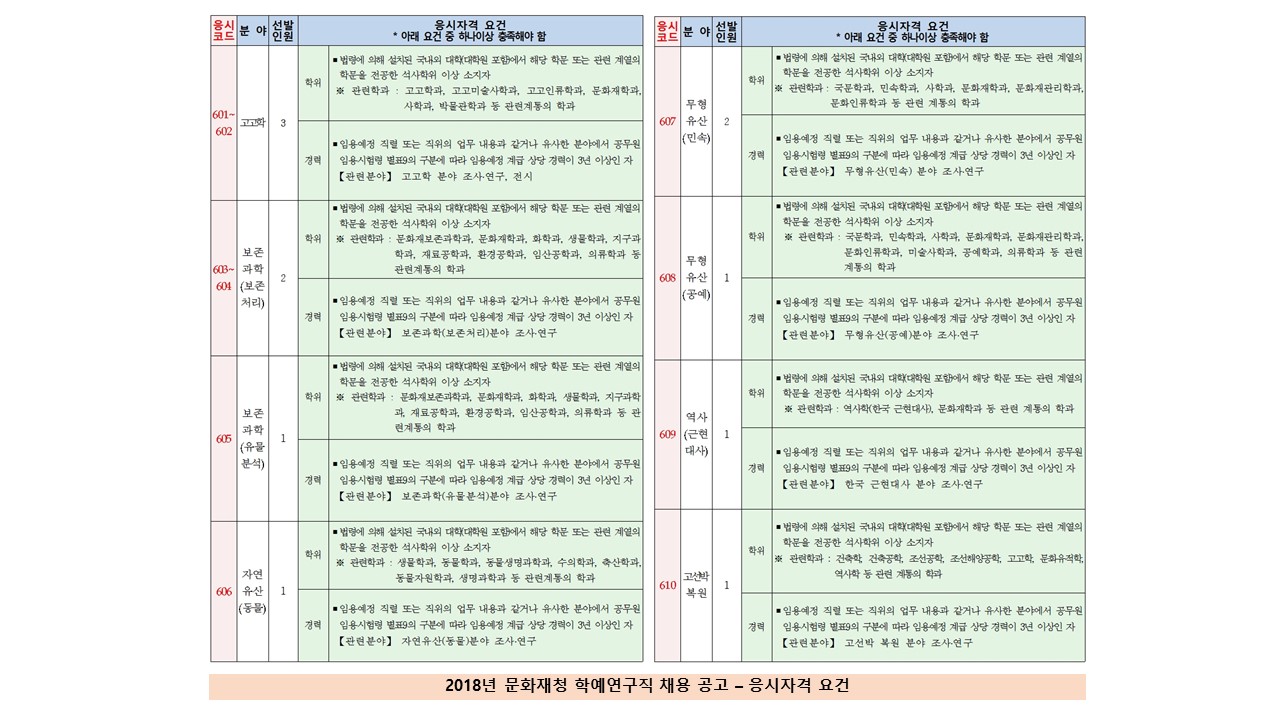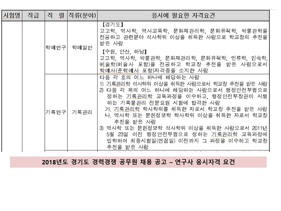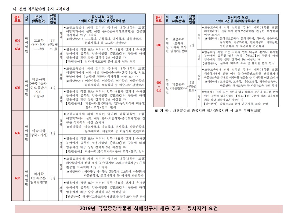 최근 문화재청(2018년), 국립중앙박물관(2019년), 경기도(2018년)의 학예연구사 채용공고를 먼저 살펴보면,