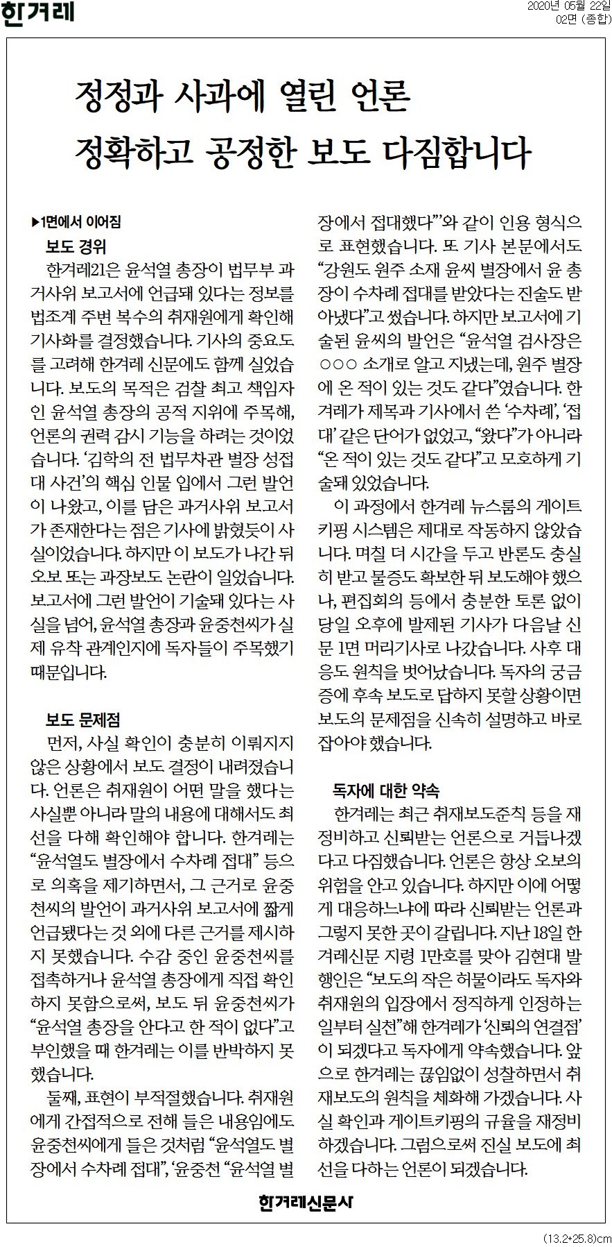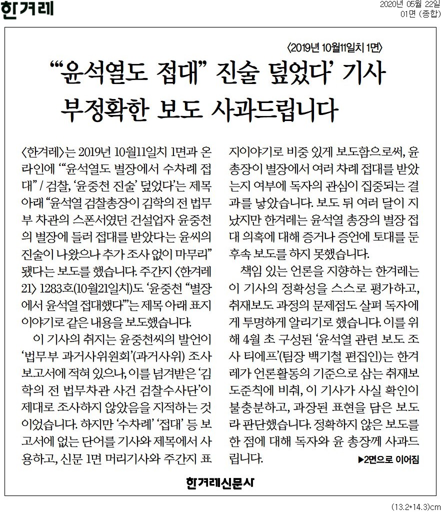 나아가 한겨레는 이들 보도가 "한겨레가 언론활동의 기준으로 삼는 취재보도준칙에 비춰, 이 기사가 사실 확인이 불충분하고, 과장된 표현을 담은 보도라 판단했습니다. 정확하지 않은 보도를 한 점에 대해 독자와 윤 총장께 사과드립니다"고 했거니와, 이는 이들 보도가 오보임을 부연한 대목이다.