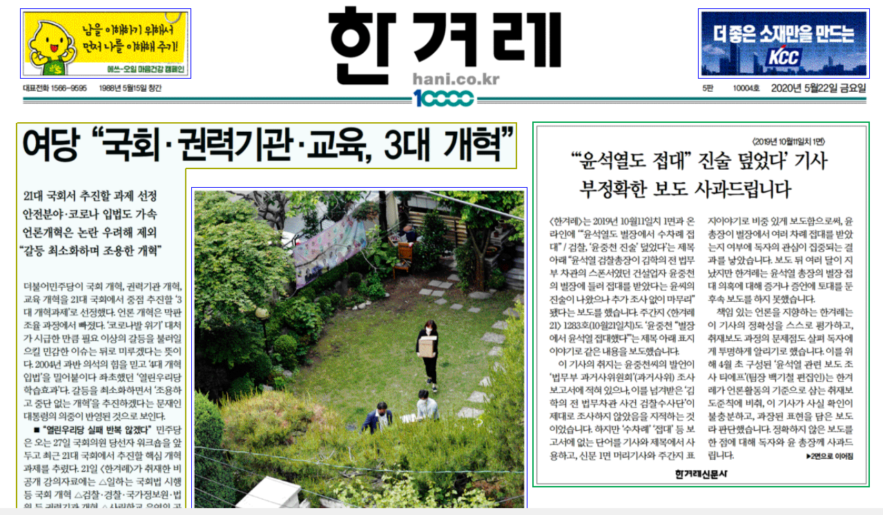 한겨례신문이 5월 22일자 1면과 2면에 걸쳐 현재의 검찰총장 윤석열이 문제의 김학의 별장에서 건설업자 윤중천한테서 수 차례 접대를 받았다는 2019년 10월 11일 보도 및 그 계열 주간 《한겨레21》 1283호(10월 21일자) 보도가 잘못됐다는 사고社告를 냈다. 한겨레의 이들 보도는 오보일까 가짜뉴스일까?
