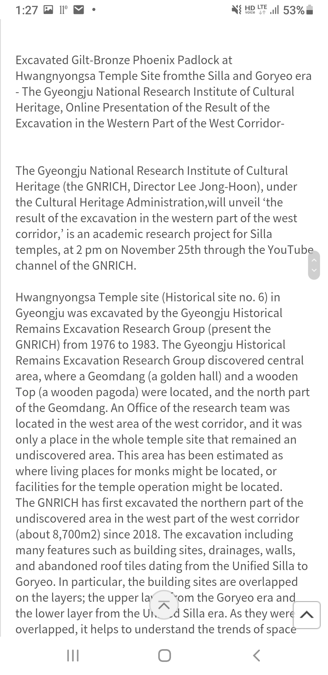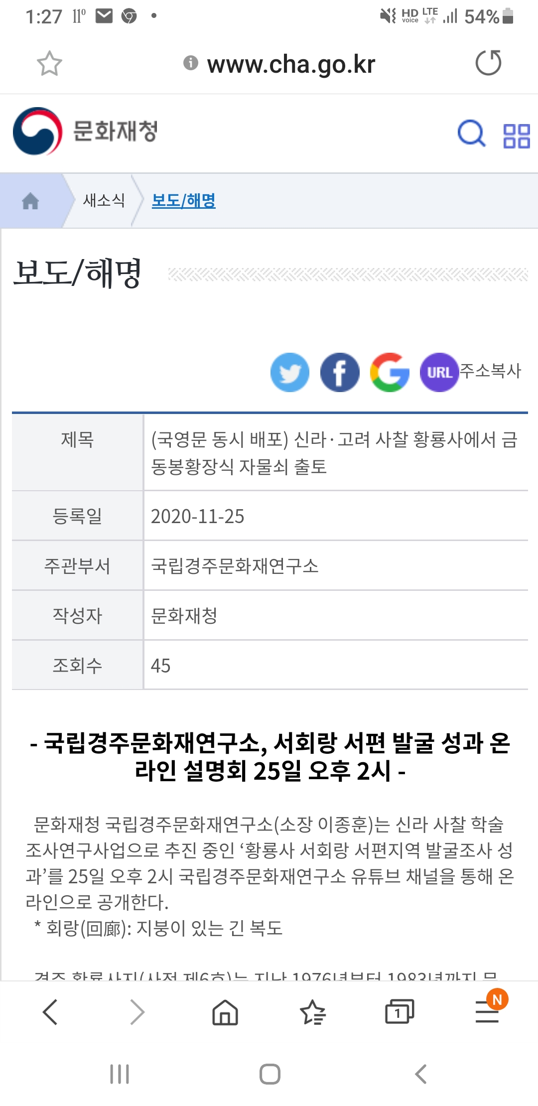 오늘 아침 배포한 경주 황룡사지 금동 자물쇠 발굴 소식이다. 보다시피 영문판도 첨부했다.