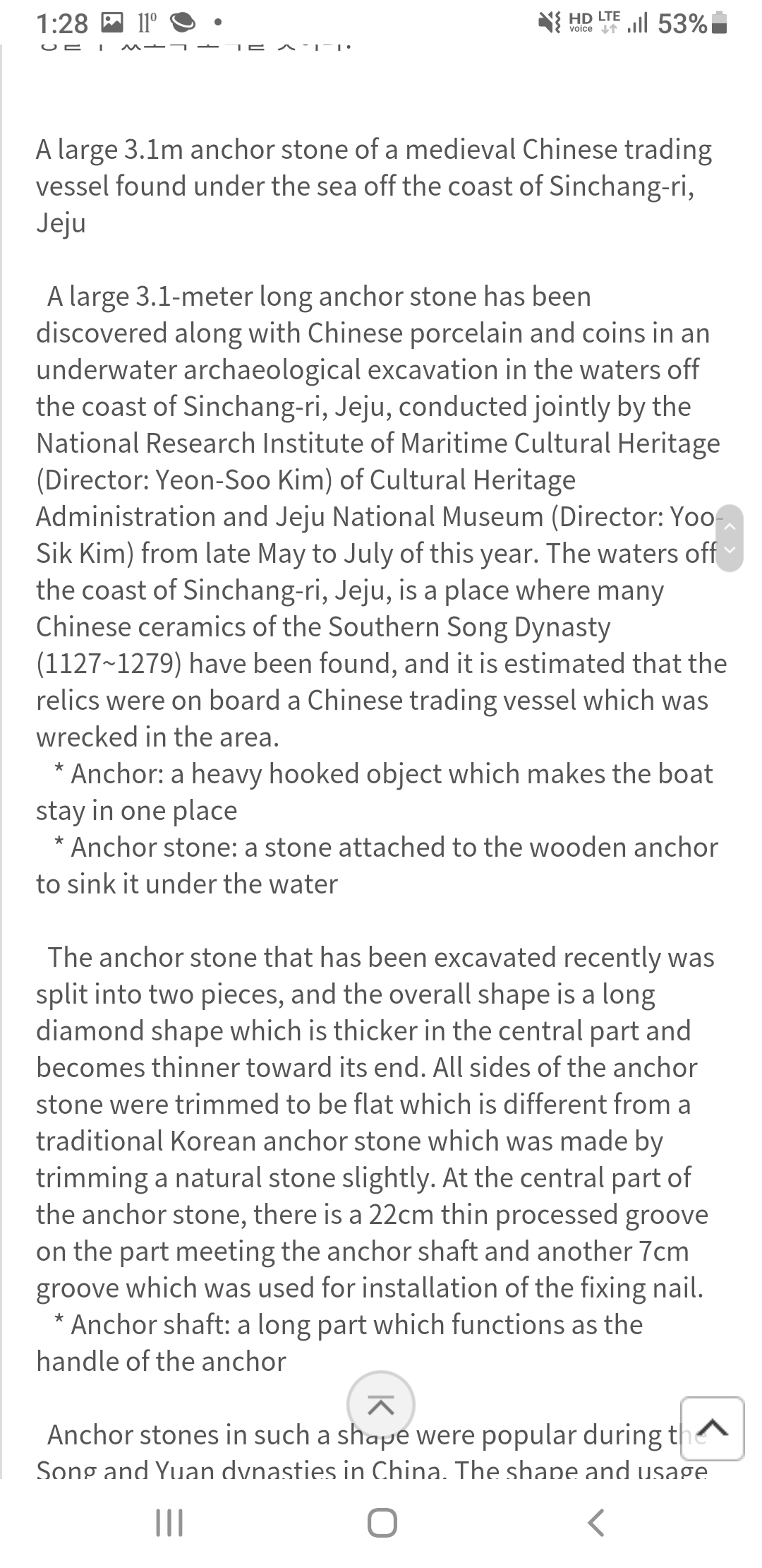 어제 제주 해역에서 송원宋元대 닻돌 발굴소식인데 어젠 영문자료가 첨부되지 아니했다가 오늘 붙었다. 이 정도 소식은 영문서비스를 해야 한다는 청장 판단이 있었다.