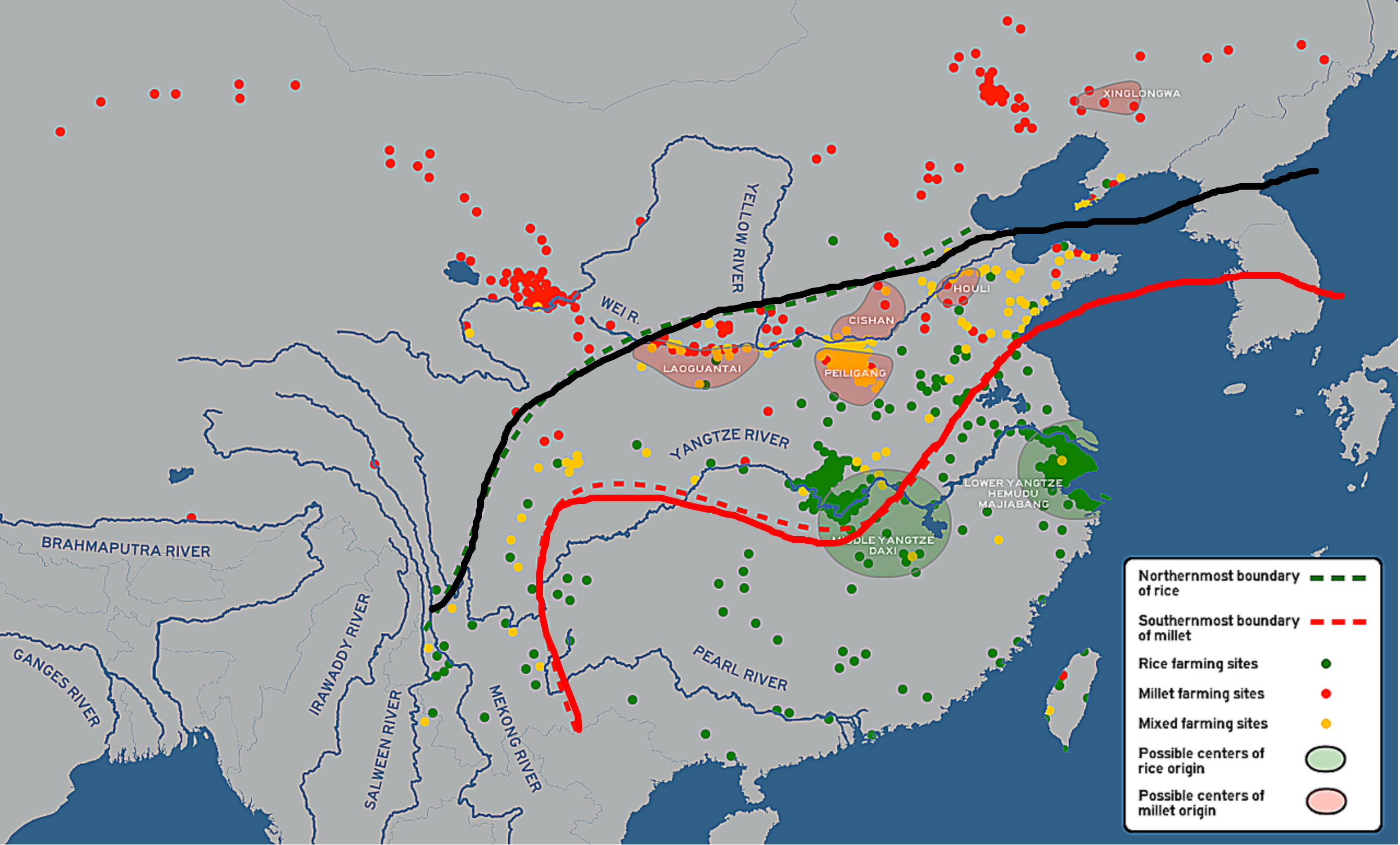 그리고 그 사이 지역 (회하일대)의 점이농경지대 (양쪽이 혼합)이다.