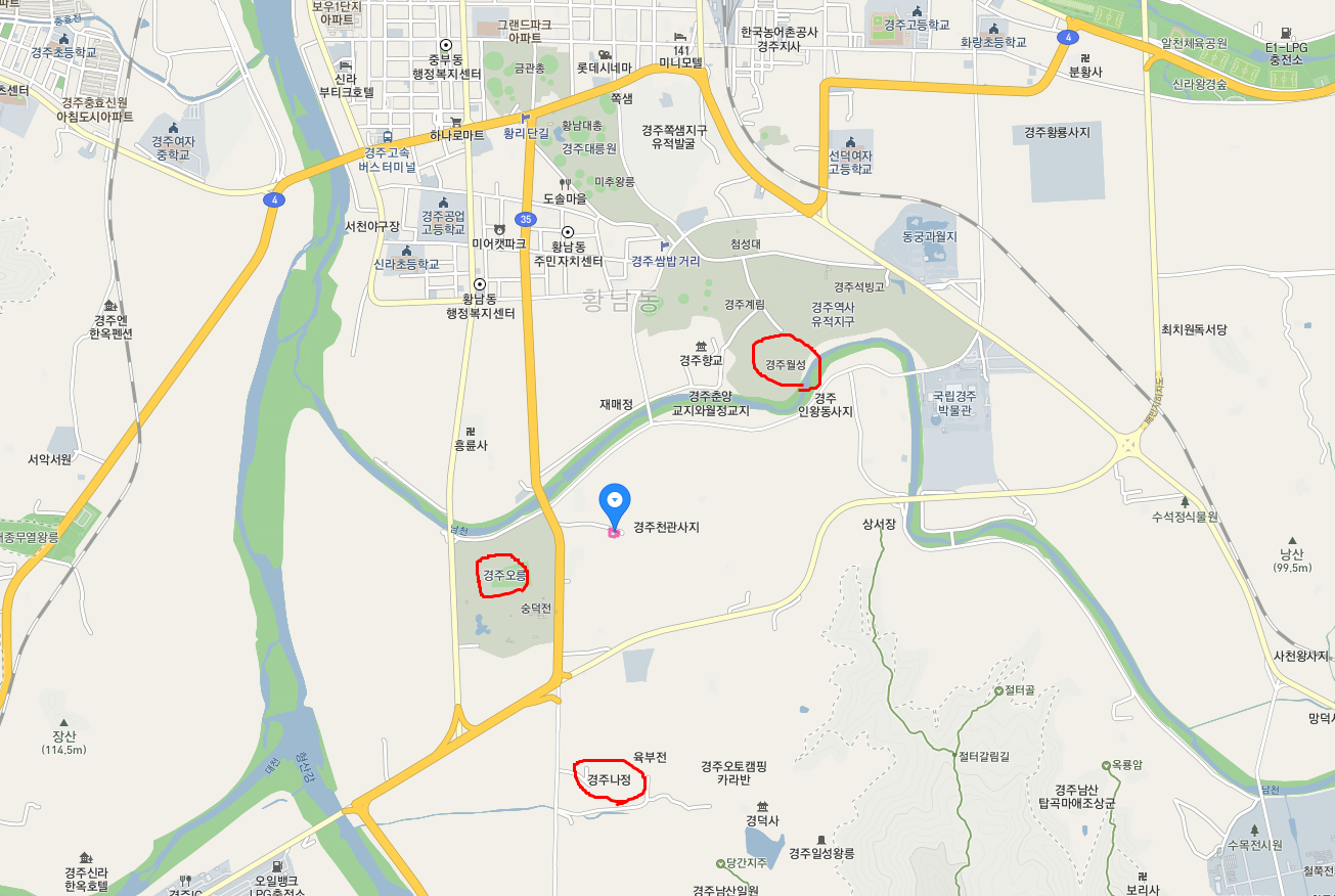 월성과는 남천이라는 시내를 사이고 두고 마주 본다 해도 틀린 말은 아니다. 지금은 전형적인 농촌 풍경인 이 동네가 실은 온통 공동묘지라는 사실은 2010년대 초반에 무렵 드러났거니와, 그 이전까지 이쪽이 공동묘지였을 것이라는 흔적은 좀체 없었다. 물론 오릉이 있어 있을 가능성은 있었지만, 워낙 훼손이 심해 동네로 바뀌고 논으로 변모하는 바람에 그 밑에 저와 같은 무수한 무덤이 내려앉아 있을 줄 누가 알았겠는가?