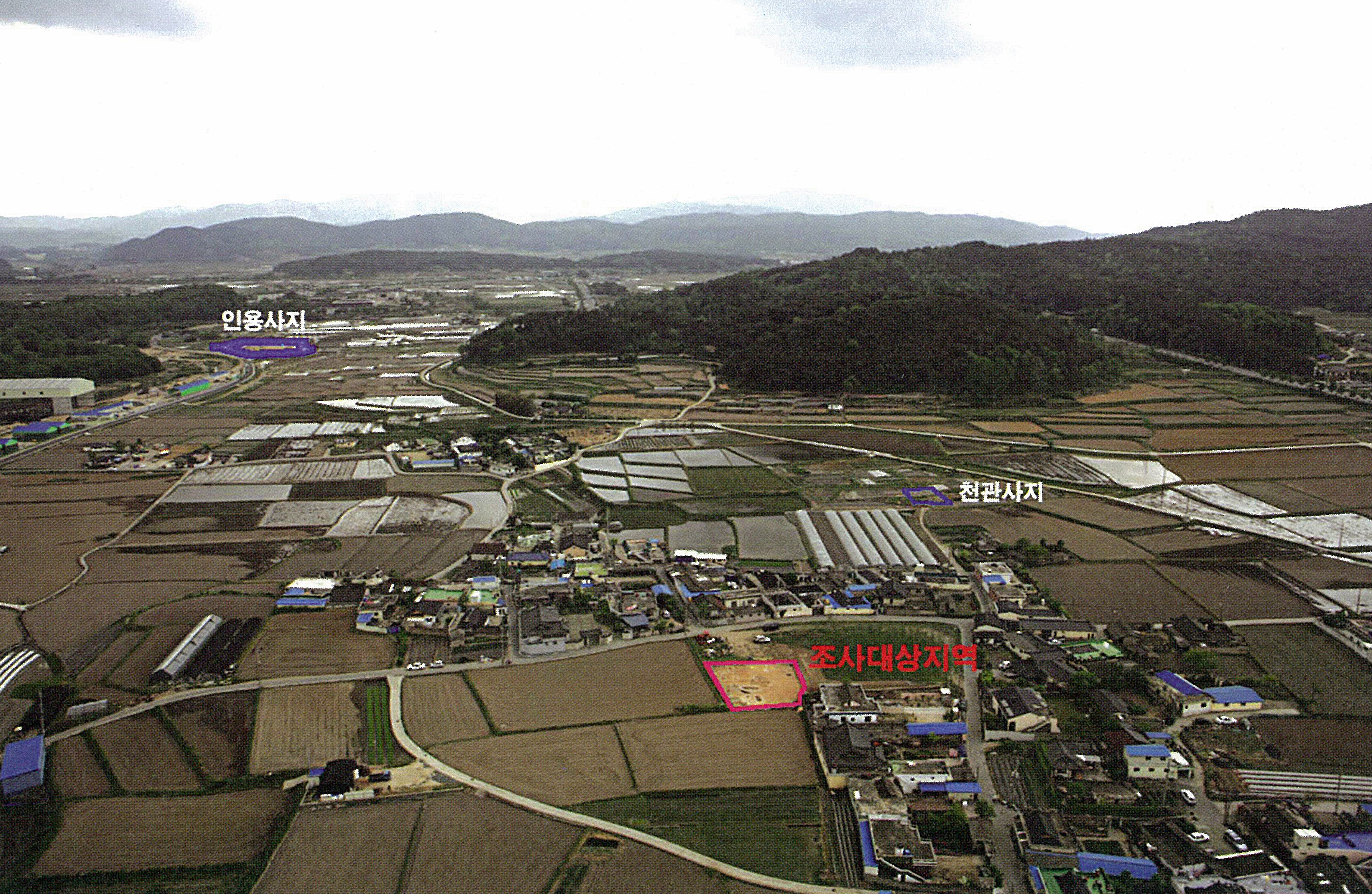 발굴지점이 경주 월성 남서편이면서 경주 오릉과는 실은 도로 하나를 사이에 둔 인접지점이라, 이짝에는 동네가 있다. 도당산 북쪽 기슭이어니와, 실은 남산 자락으로 봐도 무방하다. 또 천관사지랑은 실은 같은 지역이다.