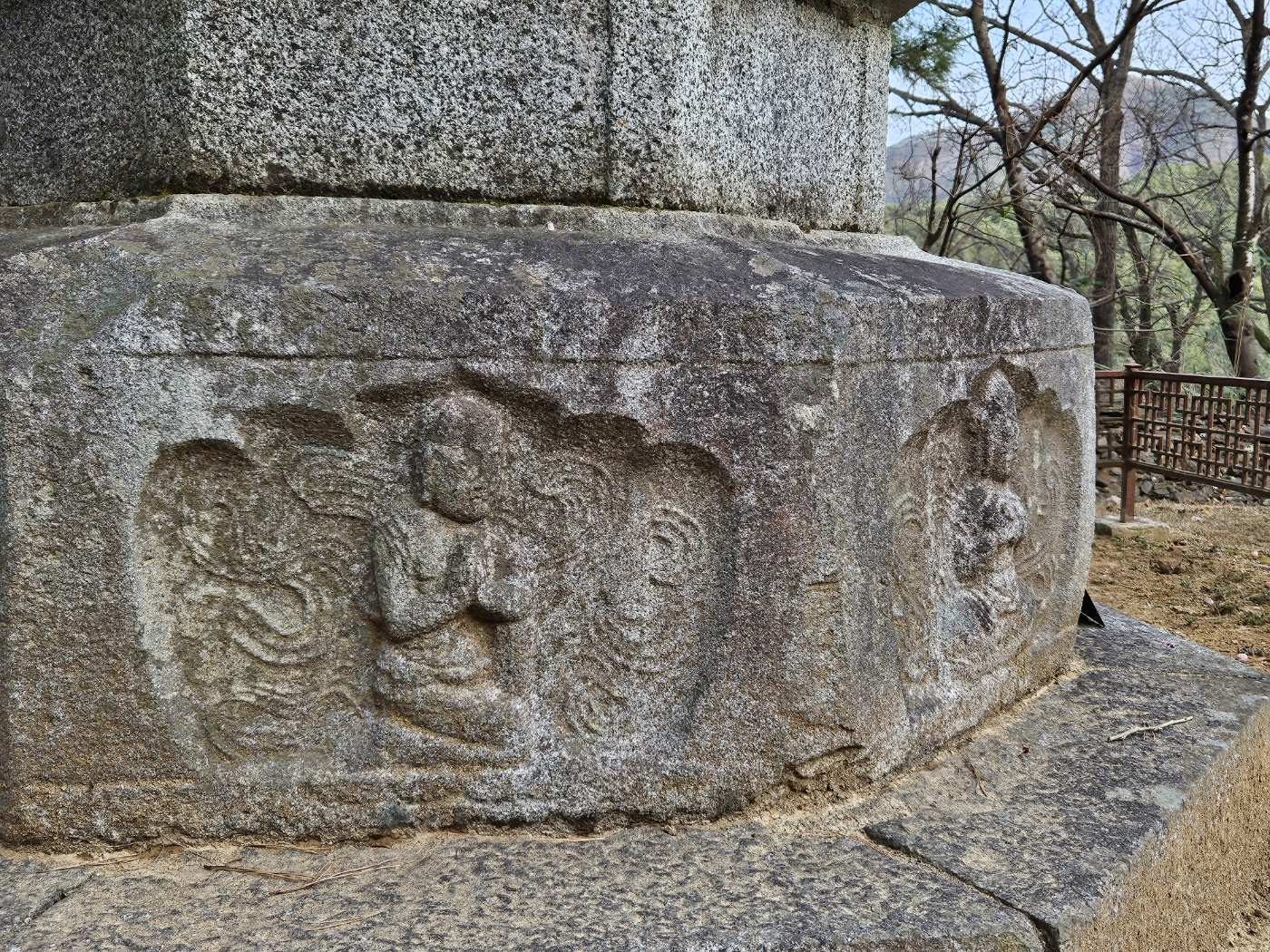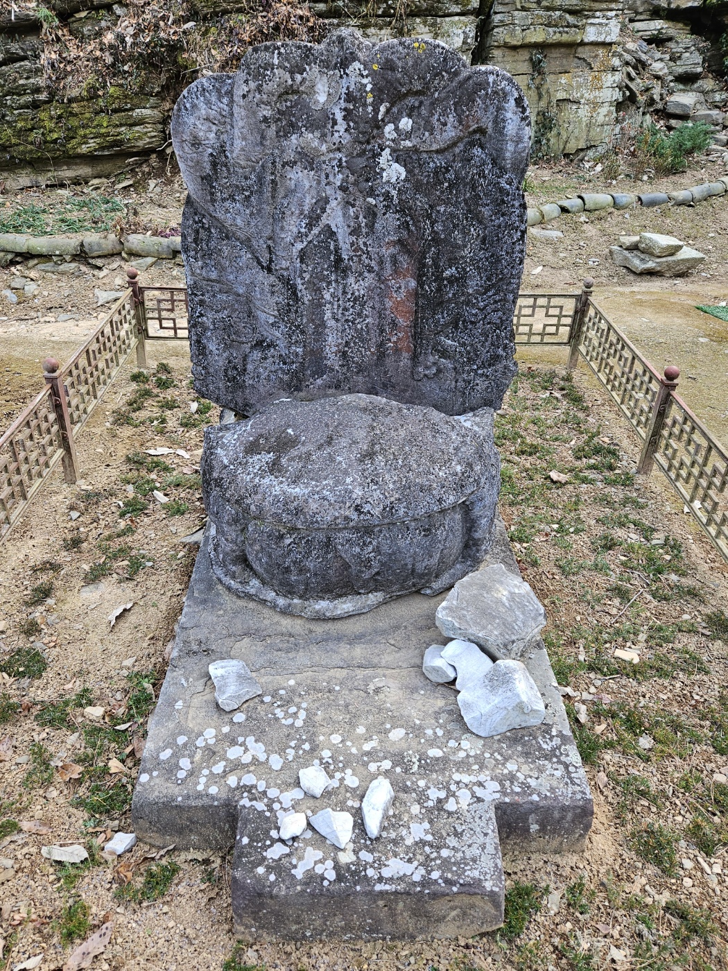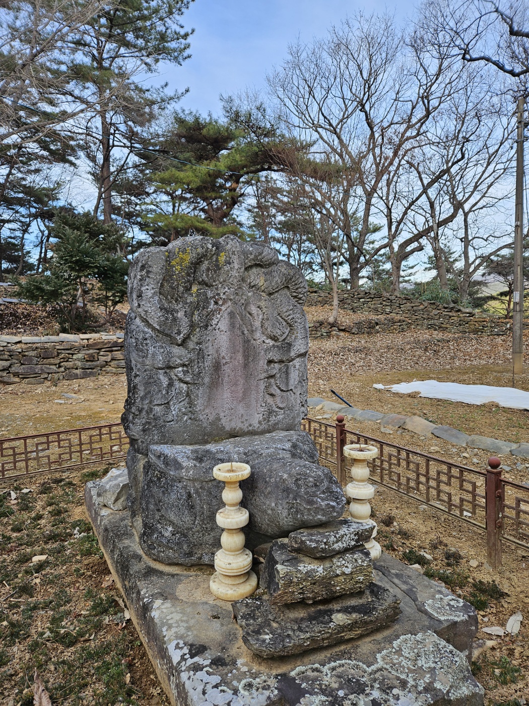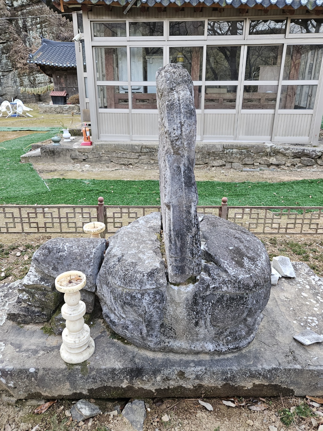 오른쪽으로 좀 깊이 들어가니 귀부 하나가 눈에 띈다. 어느 고승의 사연을 적은 비가 꽂혀 있었겠지만, 남은 건 그 비의 이수 곧 머릿돌뿐이다.