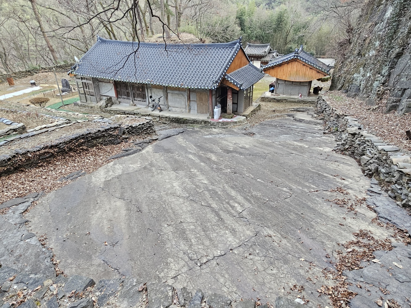 꼬불꼬불한 대나무 뿌리가 어찌나 기운 센지 더러 기와조각을 꽉 움켜쥐기도 하고 또 암반을 깨고 들어가기도 한다. 그 뿌리가 틔운 대밭이 다할 즈음 절 아닌 재실 하나가 나타난다.