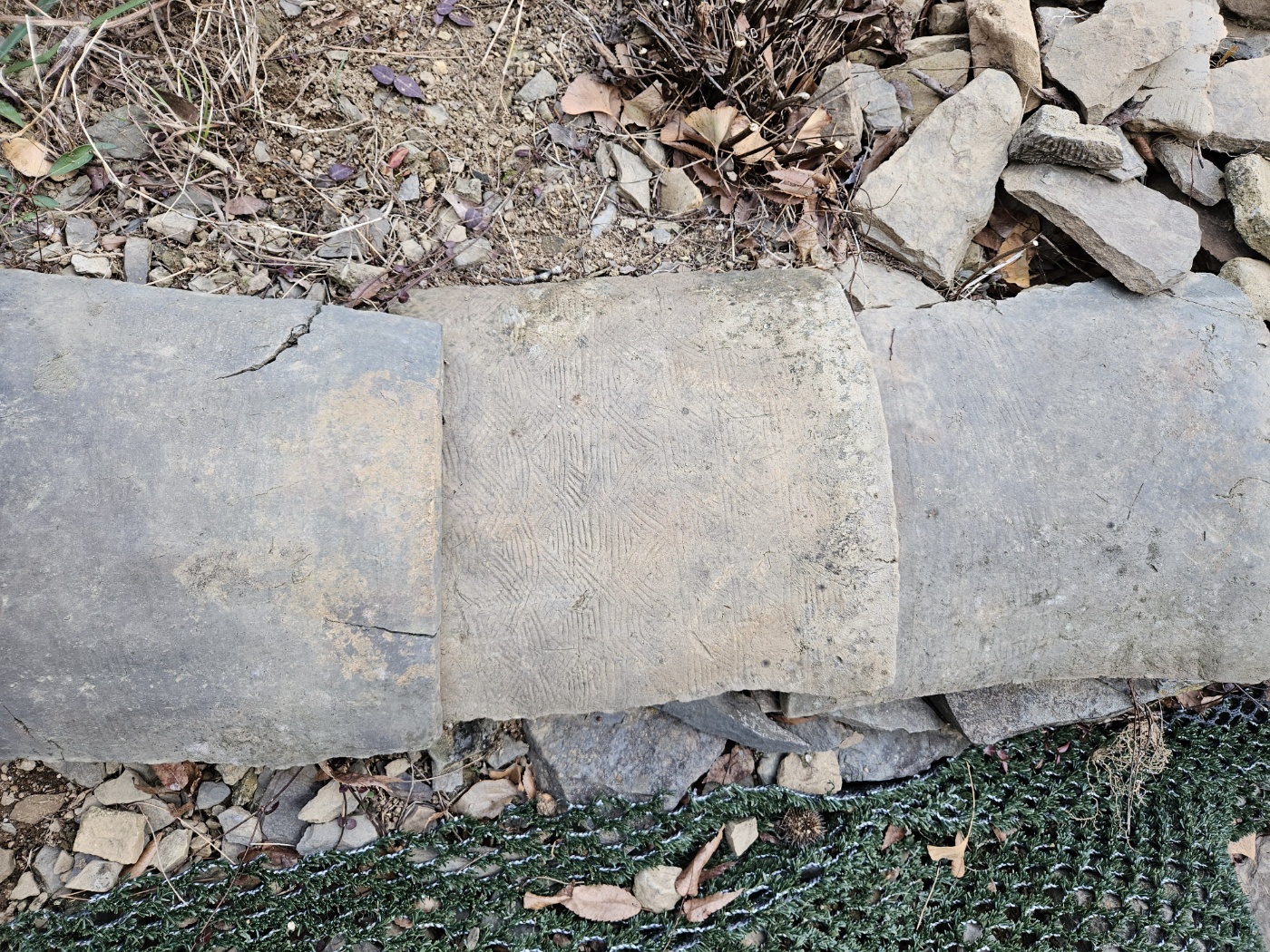 물고기뼈 모양 어골무늬도 있고 격자무늬나 비내리는 것 같은 무늬가 새겨진 것도 있고, 더러 흐릿하게나마 명문이 남은 것도 보였다. 녹유를 바른 전돌이 나오기도 한단다.