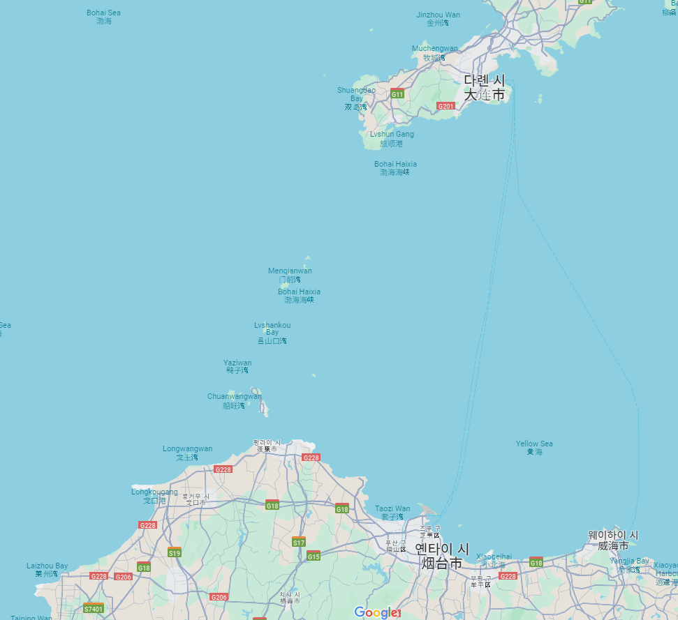 산동반도와 요동반도는 확대해서 보면 이 사이에 작은 섬들이 10킬로 미터 정도의 간격을 두고 배열되어 있어