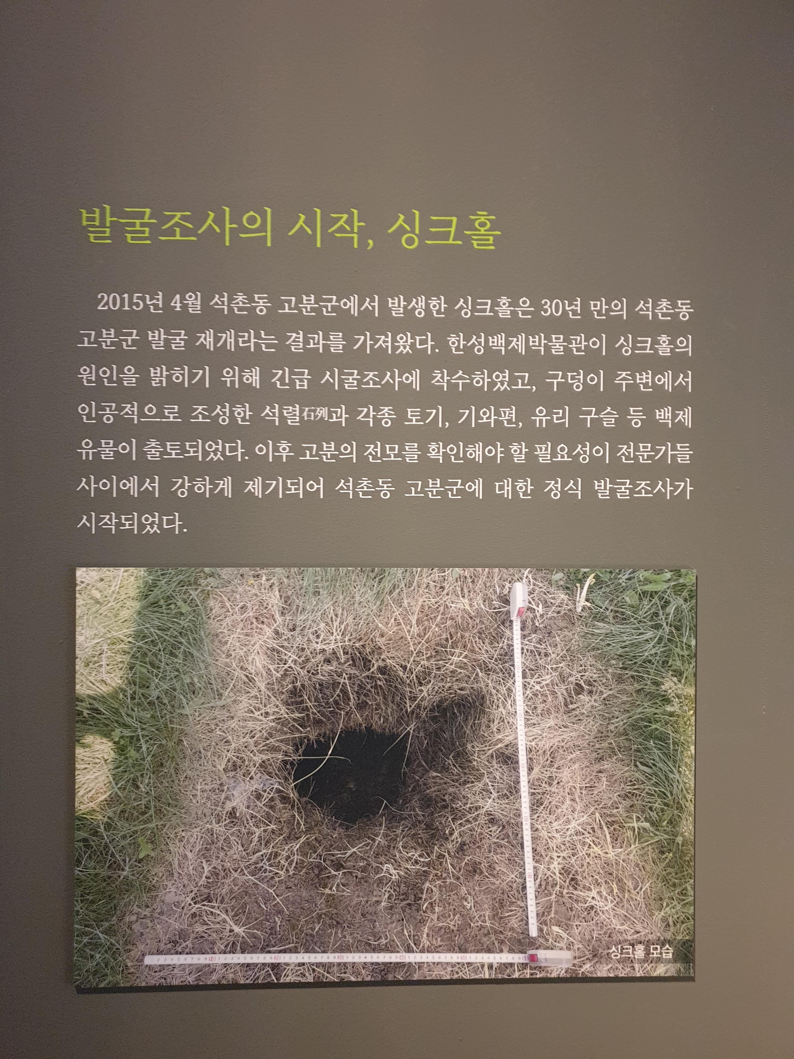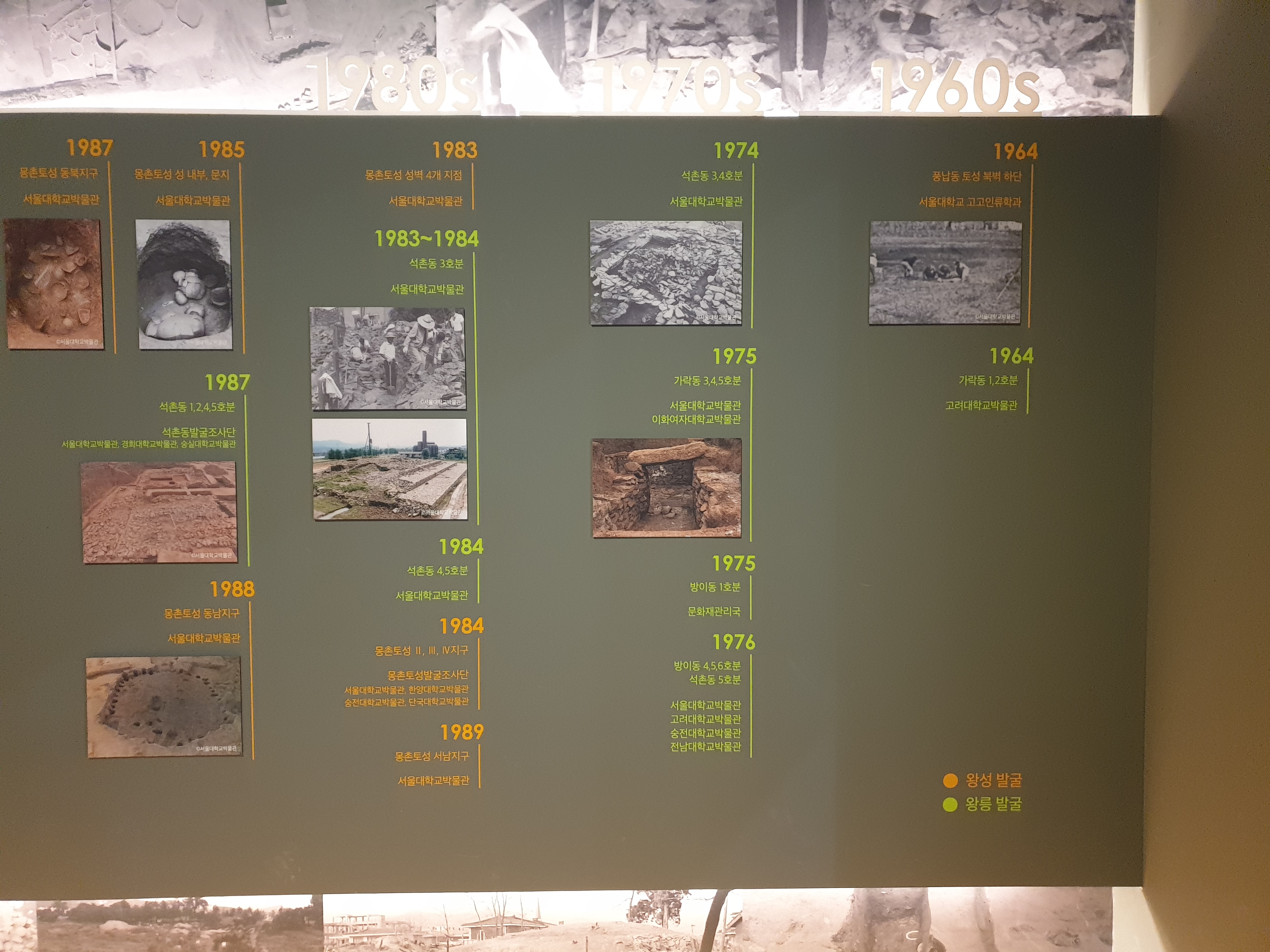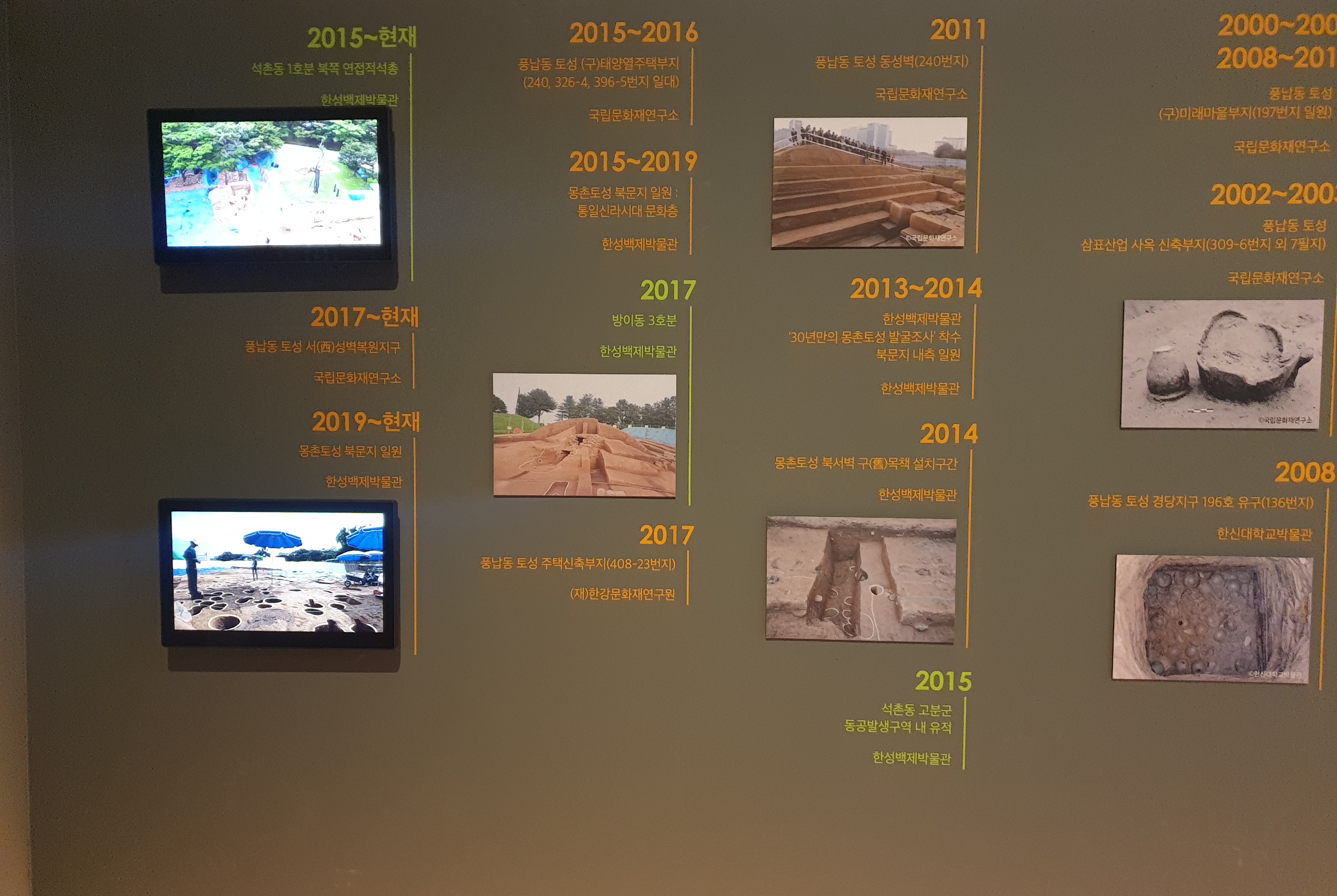한성백제박물관은 몽촌토성과 석촌동고분군 발굴에 집중했으니 이 중 전체구역이 사적으로 묶였고 공원으로 조성되어 이렇다 할 보호장치가 필요없는 몽촌은 순전히 학술연구차원에서 80년대 발굴이 워낙 개판이었던 까닭에 새로운 발굴이 필요했던 반면, 석촌동고분군은 느닷없는 맨홀 퐁당 사건이 벌어지는 바람에 느닷없이 발굴조사가 시작되었다.