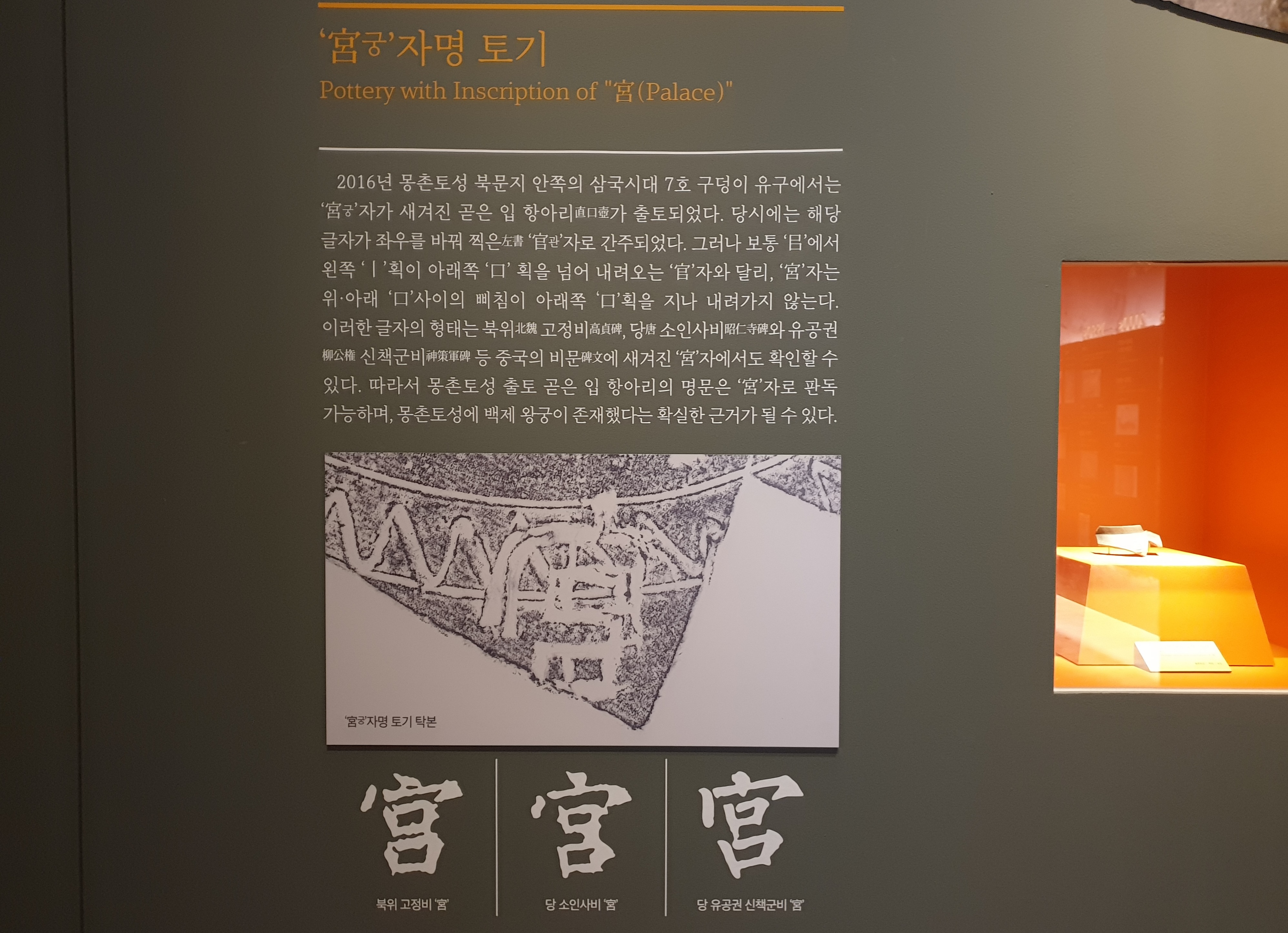 유의할 점은 석촌동고분군이 철저히 한성백제가 전유專有하는 데 견주어, 몽촌토성은 한성백제 흔적이 매우 두터운 가운데서도 고구려 흔적이 더러 있고, 그 이후에는 신라가 남긴 흔적 또한 녹록치 아니하는 복합유적이라는 점에서 다르다. 따라서 이번 특별전 몽촌 코너에서는 백제를 중심으로 고구려, 신라로 문화층을 나누어 그 성과를 소개한다.