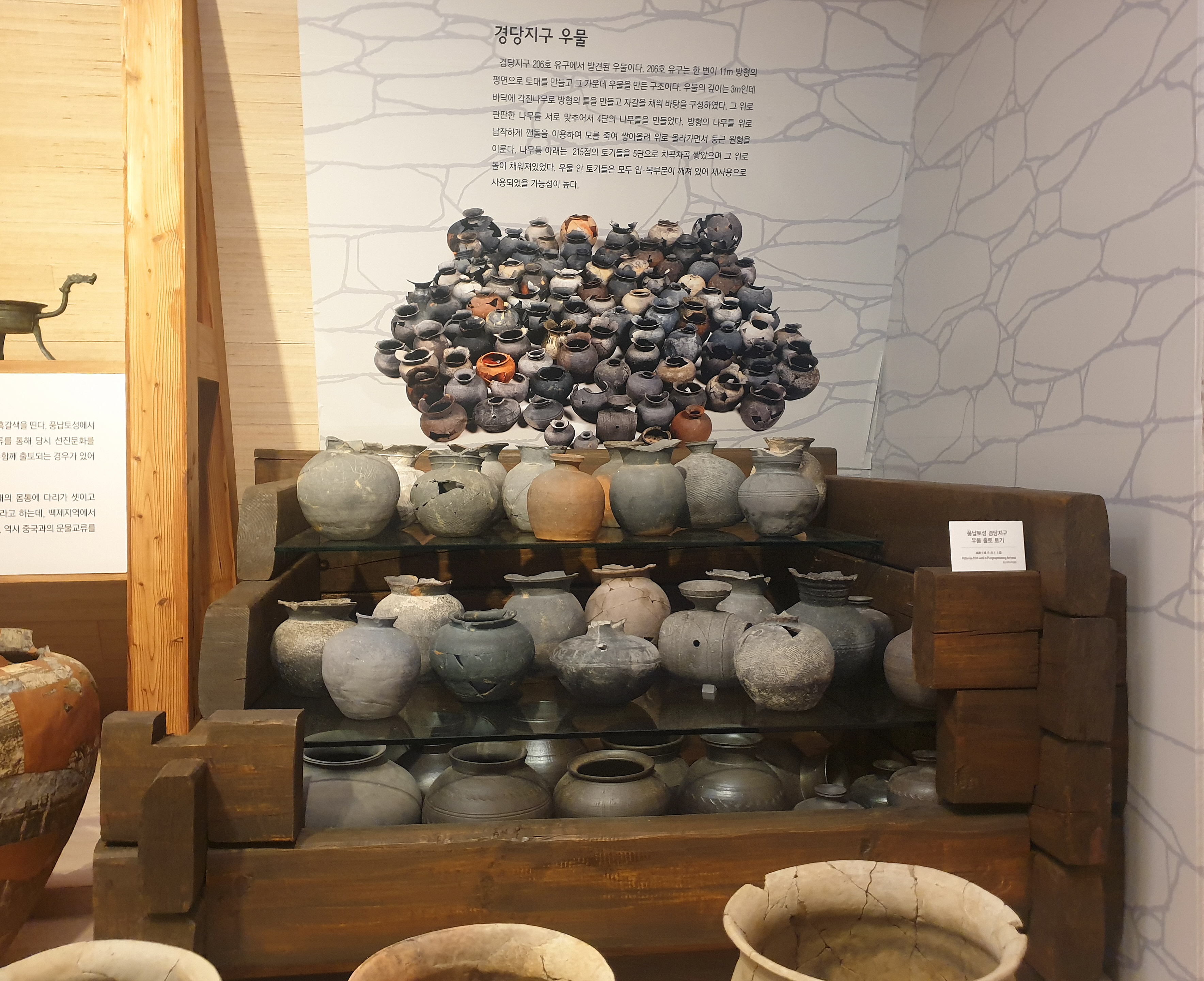 1. 풍납토성 백제우물 출토 그릇들. 설명문을 보면 215점에 달하는 저들 그릇은 모조리 주둥이를 일부러 깨뜨린 흔적이 발견됐기 때문에 제사용으로 추정된다는 말이 있다. 이런 설명은 “보통 이 시대 무덤에 넣은 껴묻거리를 보면 그것이 죽은 사람을 위한 물건이라는 뜻에서 멀쩡한 그릇들을 일부러 깨뜨린 흔적이 발견되는 것으로 보아, 이들 그룻도 우물이 죽어 더 이상 사용하지 않는다는 뜻에서 메꾸면서 넣은 것으로 보인다”는 정도로 설명이 있어야 한다.