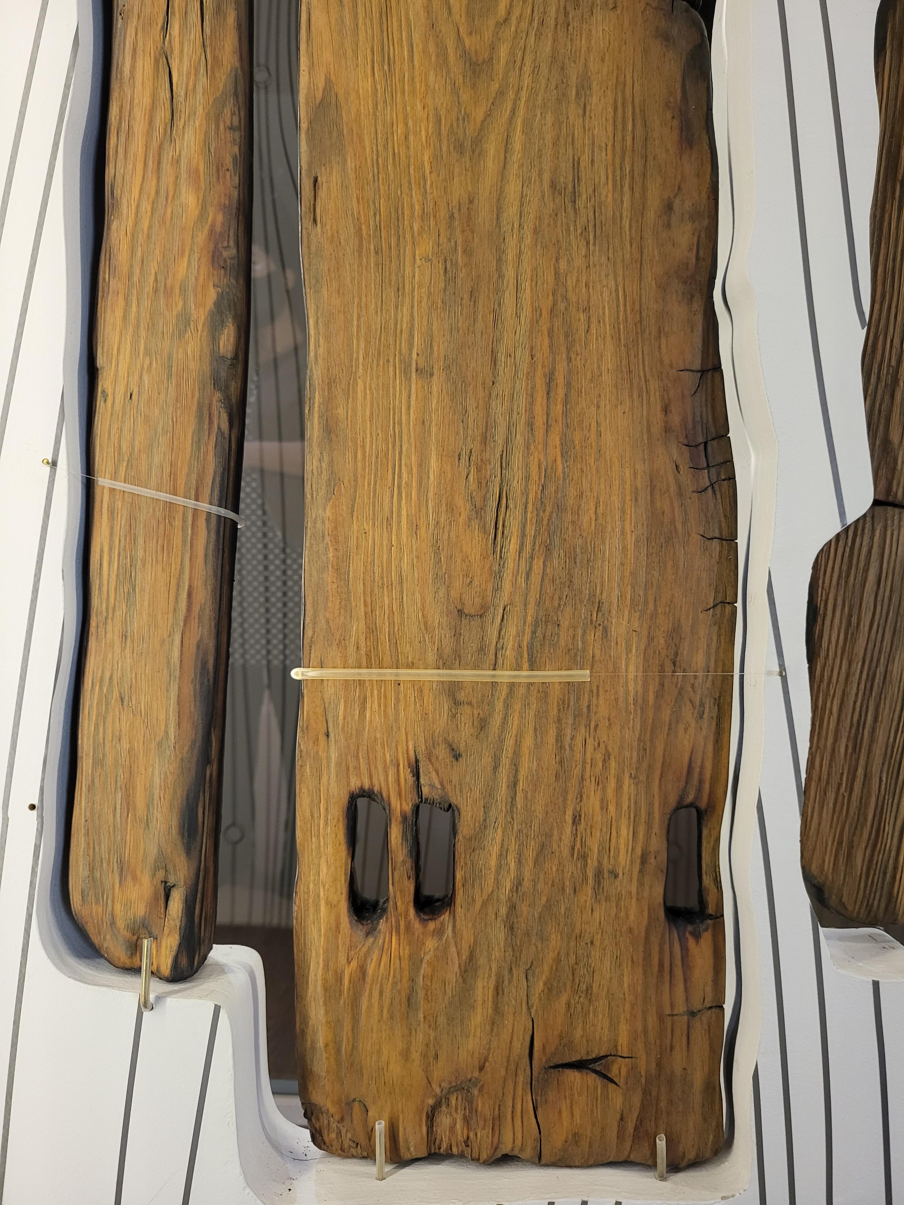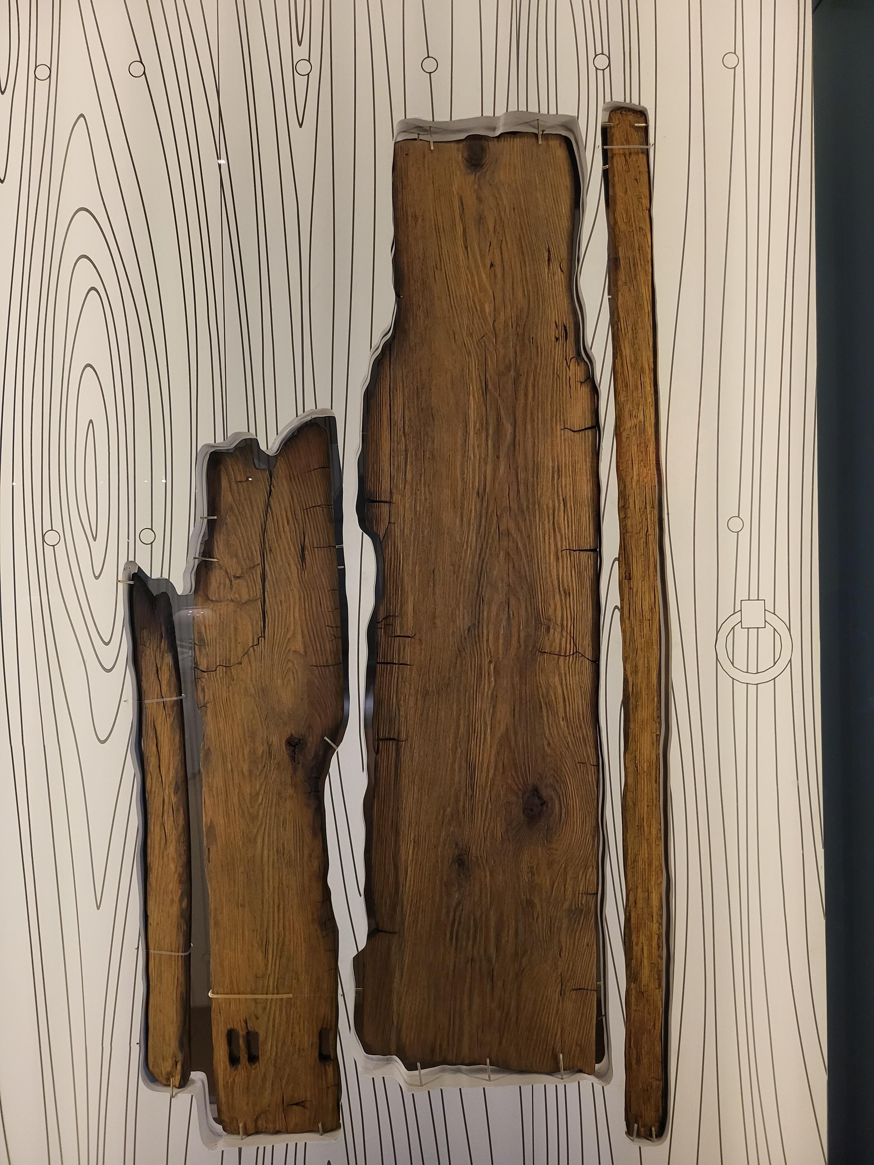 ここに展示された板門も、チョンジン洞都心再開発地に対する発掘の過程で出土されたもので、これまで発掘されたもの中で最古の板門です。400年以上地中に埋もれていたこの板門は、発掘当時、前面がひどく焼けたまま家の内側に倒れた状態で発見されました。おそらく16世紀のある時期、チョンジンドン(清進洞)の住宅街で戦乱又は火災が起き、焼けたのではないかと思われます。2つの厚い松の板を付けてつくられており、門の横に並んで立てられた補助用の扉と推定されています。