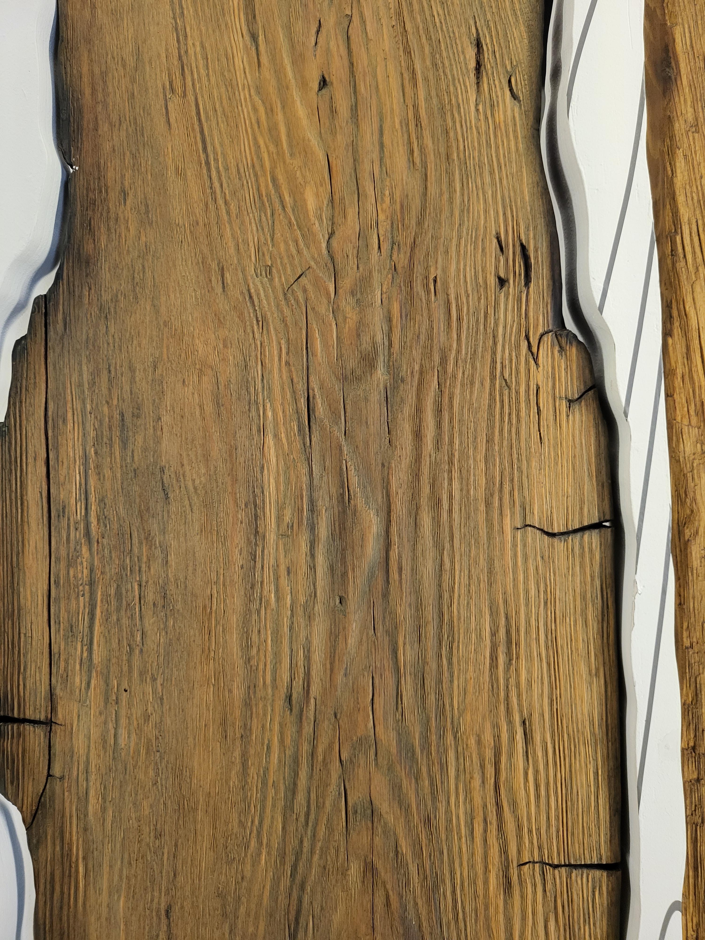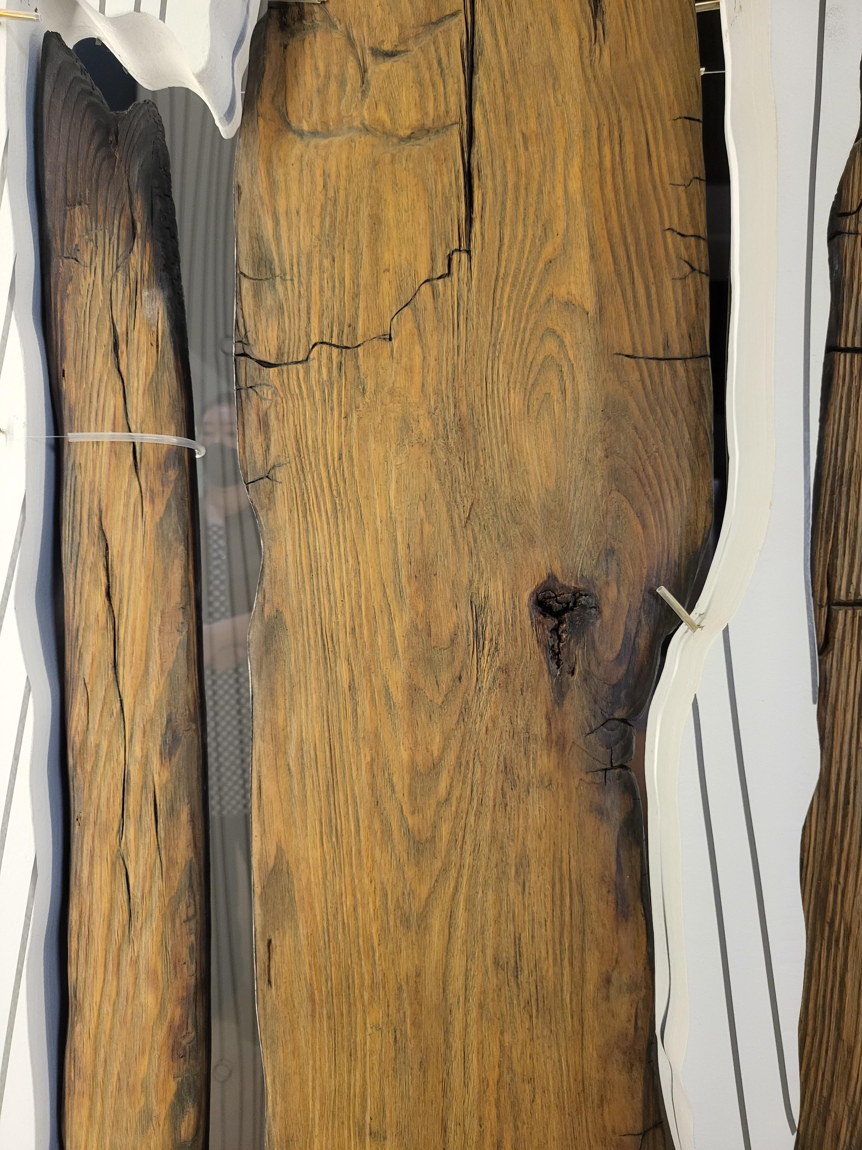 ここに展示された板門も、チョンジン洞都心再開発地に対する発掘の過程で出土されたもので、これまで発掘されたもの中で最古の板門です。400年以上地中に埋もれていたこの板門は、発掘当時、前面がひどく焼けたまま家の内側に倒れた状態で発見されました。おそらく16世紀のある時期、チョンジンドン(清進洞)の住宅街で戦乱又は火災が起き、焼けたのではないかと思われます。2つの厚い松の板を付けてつくられており、門の横に並んで立てられた補助用の扉と推定されています。