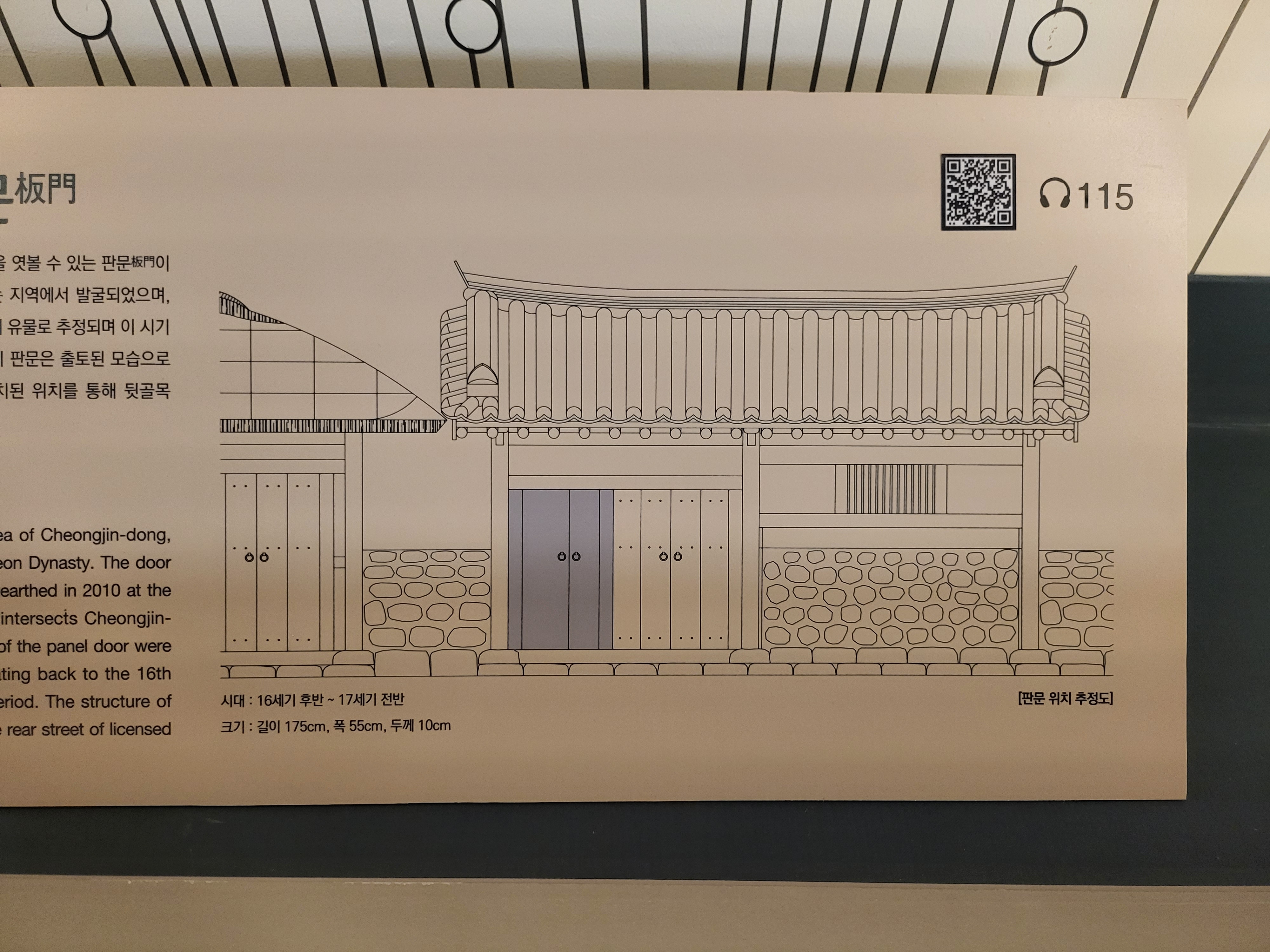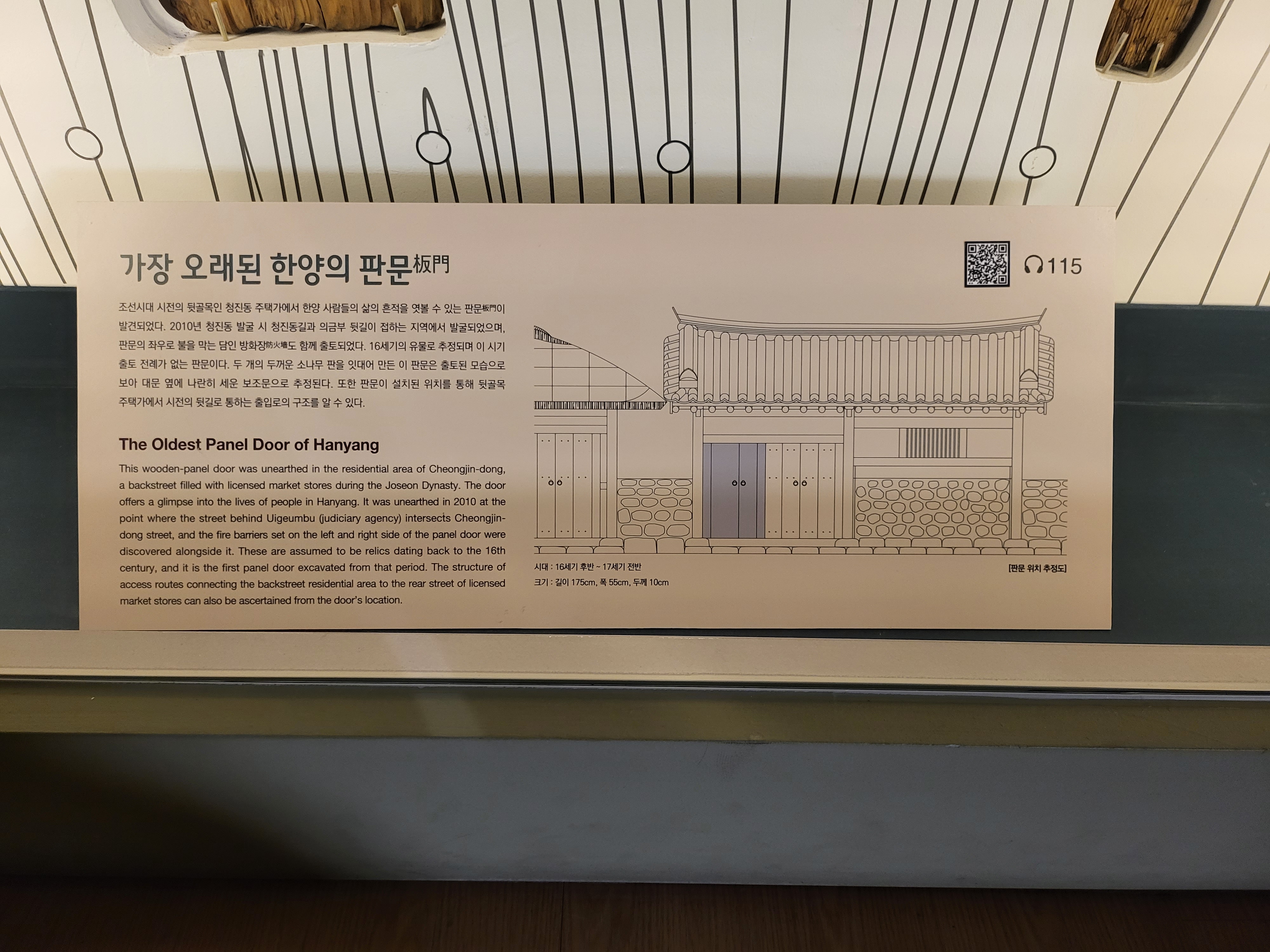 이곳에 전시된 판문板門도 청진동 도심 재개발부지 발굴과정에서 출토된 것입니다. 지금까지 발굴된 것으로는 가장 오래된 판문이라고 할 수 있습니다.