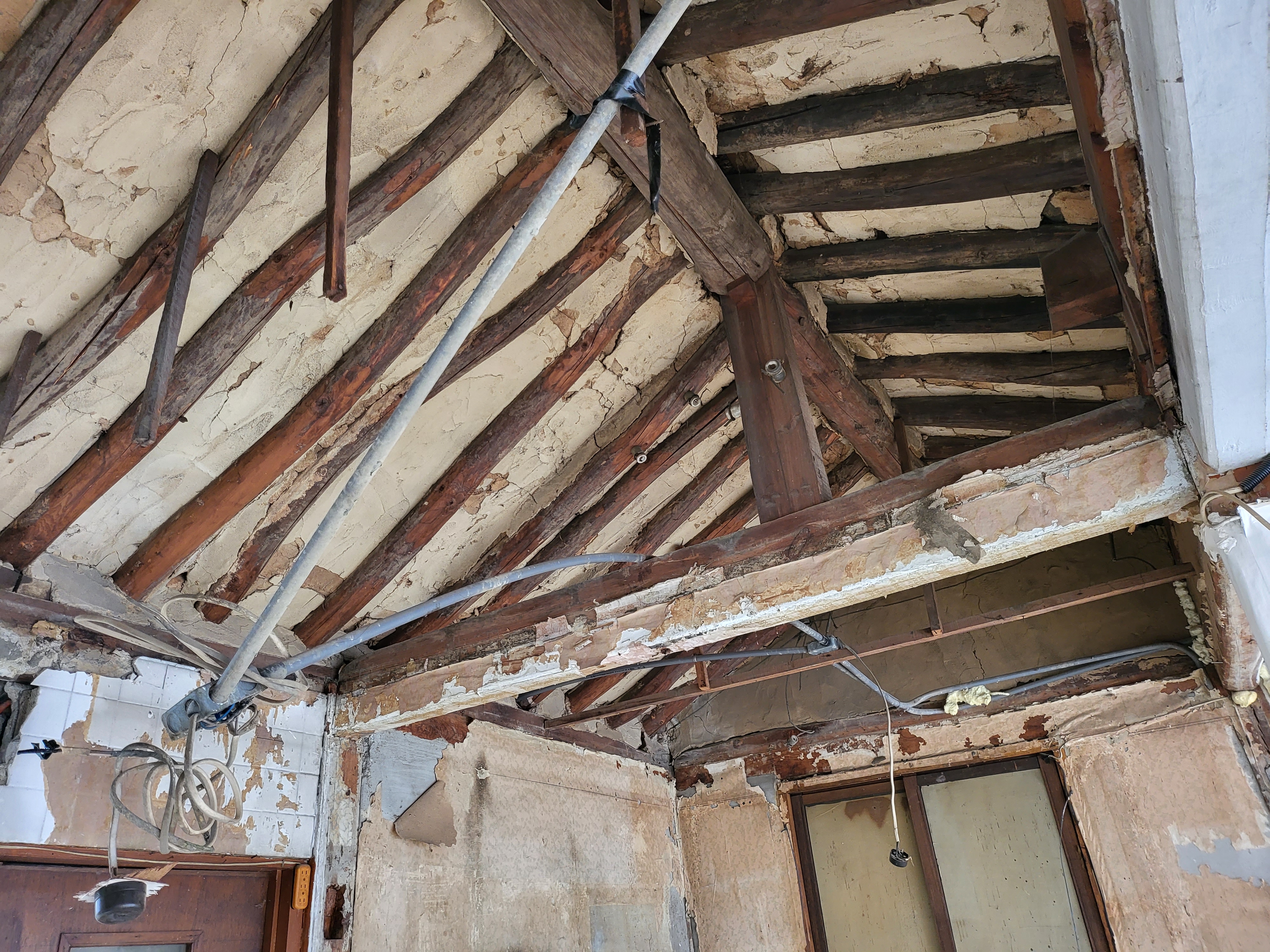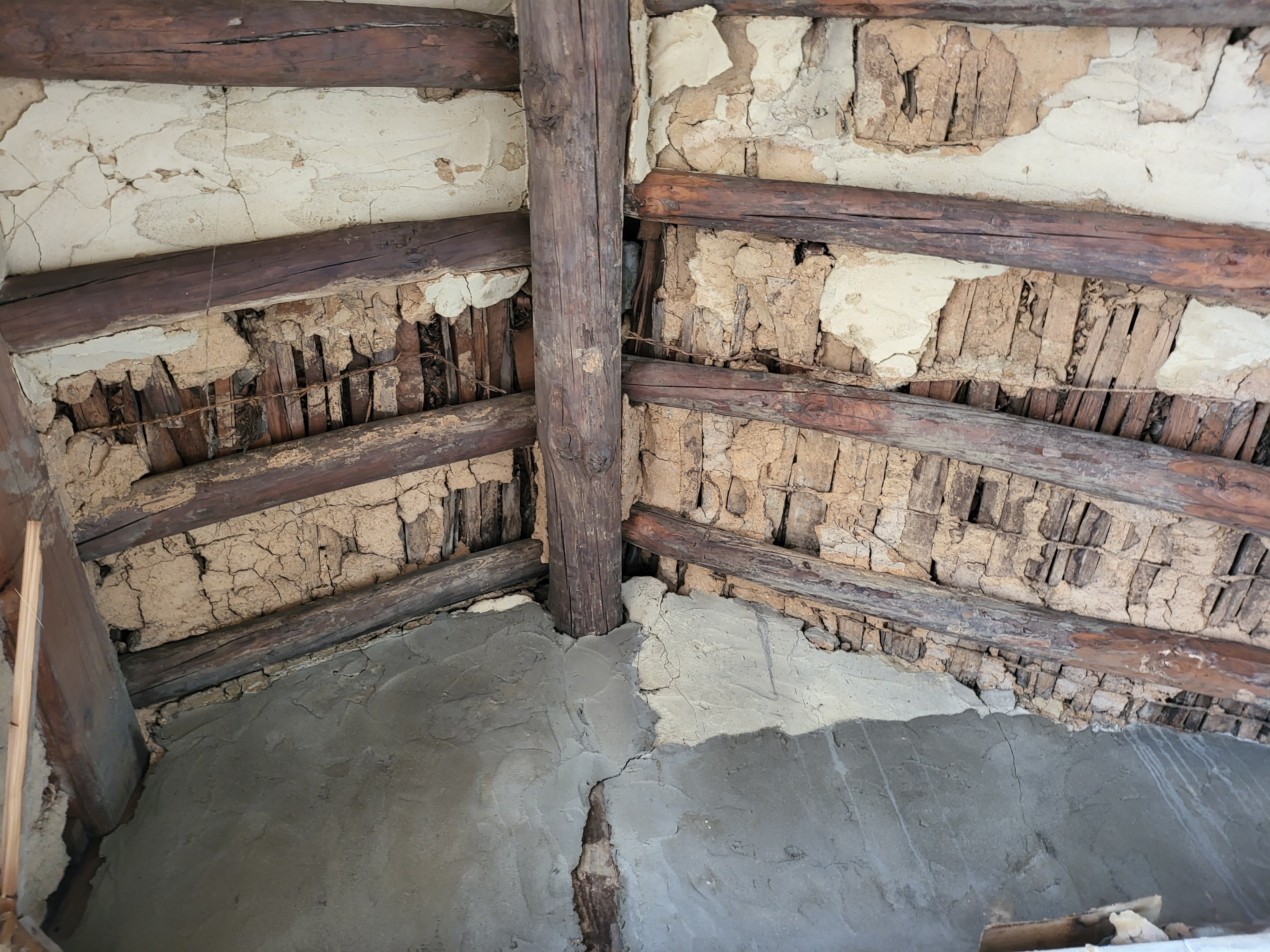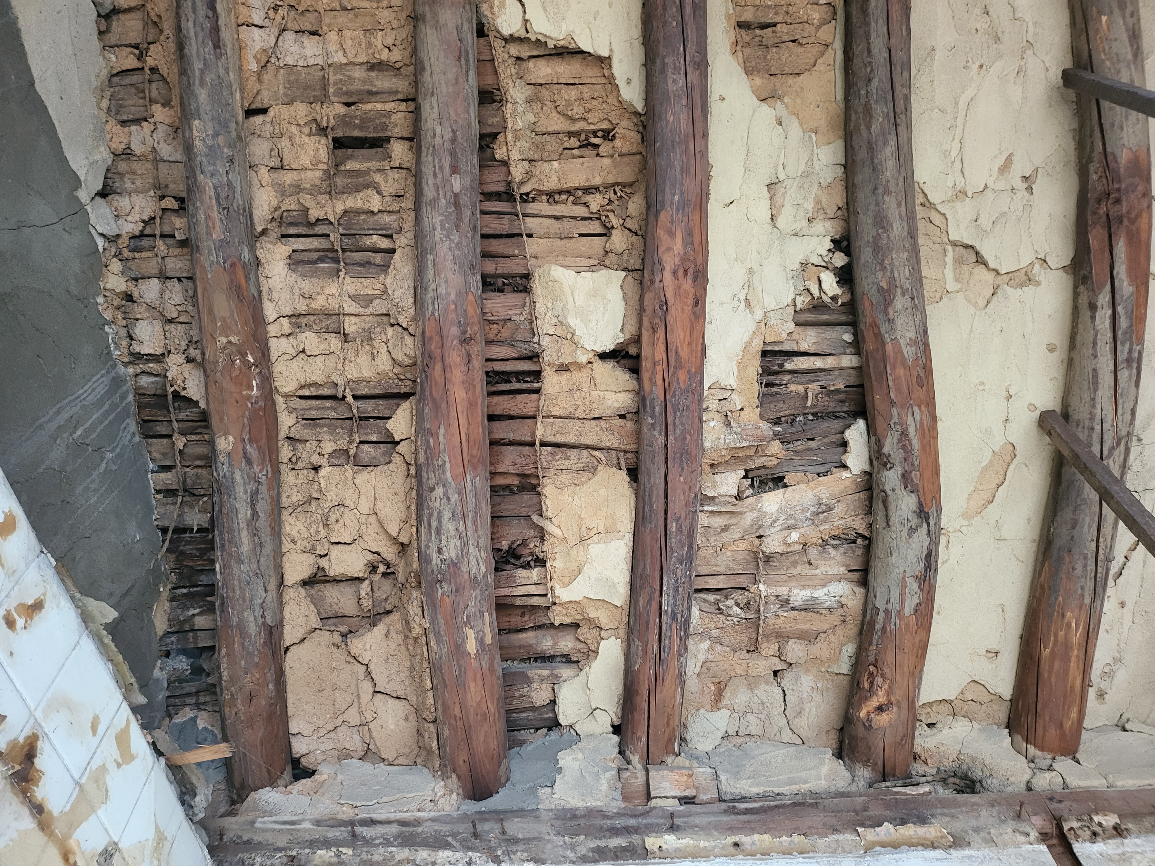 서까래랑 사이에 저와 같은 판대기 혹은 톱만 뭉치들을 덕지덕지 끼워넣고는 그 겉만 진흙으로 바르는 양상인데,