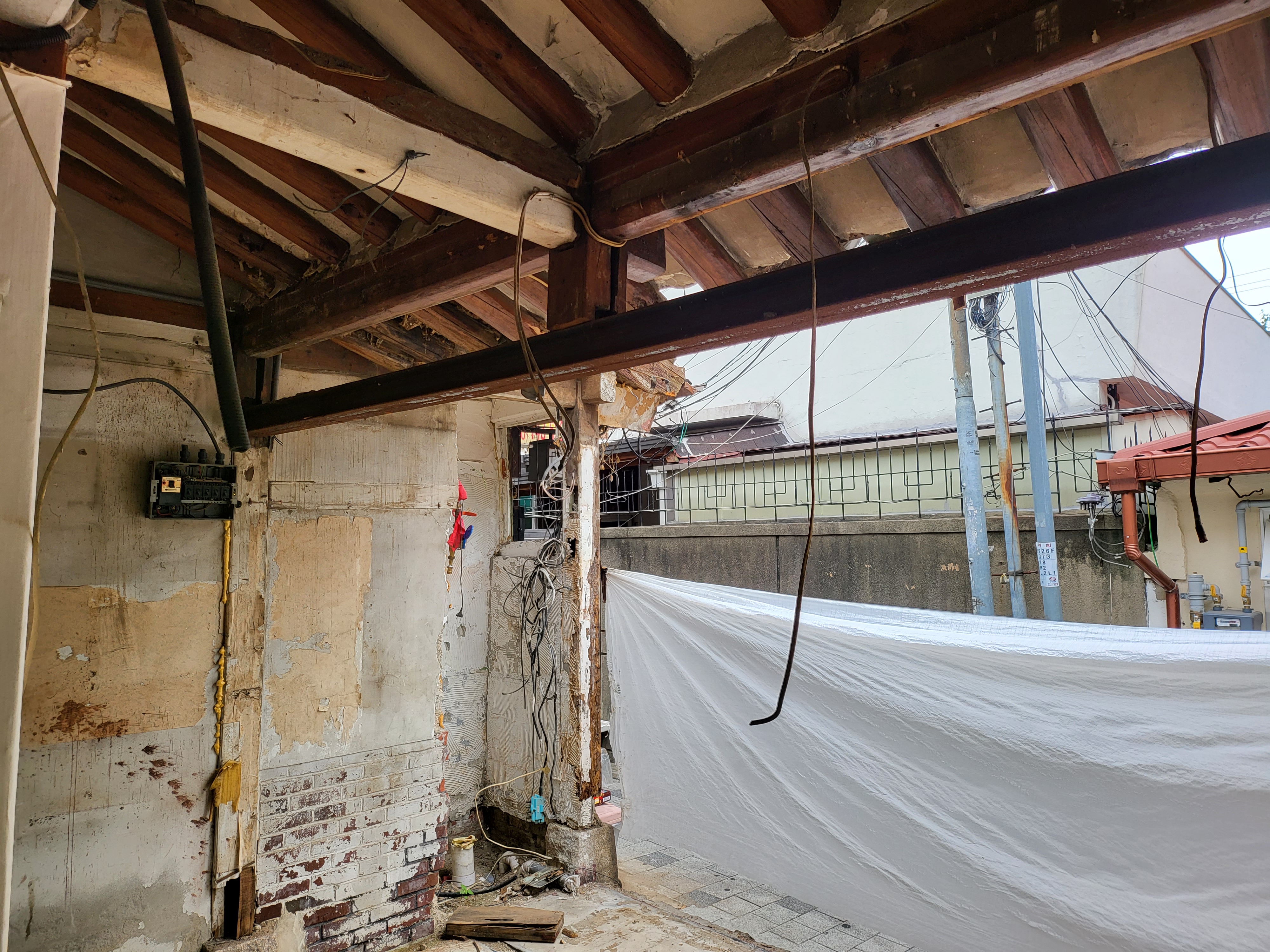 암튼 저렇게 떨가져 나온 틈새를 보면 그 내부 구조가 완연히 보이는데, 저것이 기존 전통 한옥의 일반적인 양상이요, 요새 복원한다는 한옥이라 해서 근간이 다를 바는 없다.