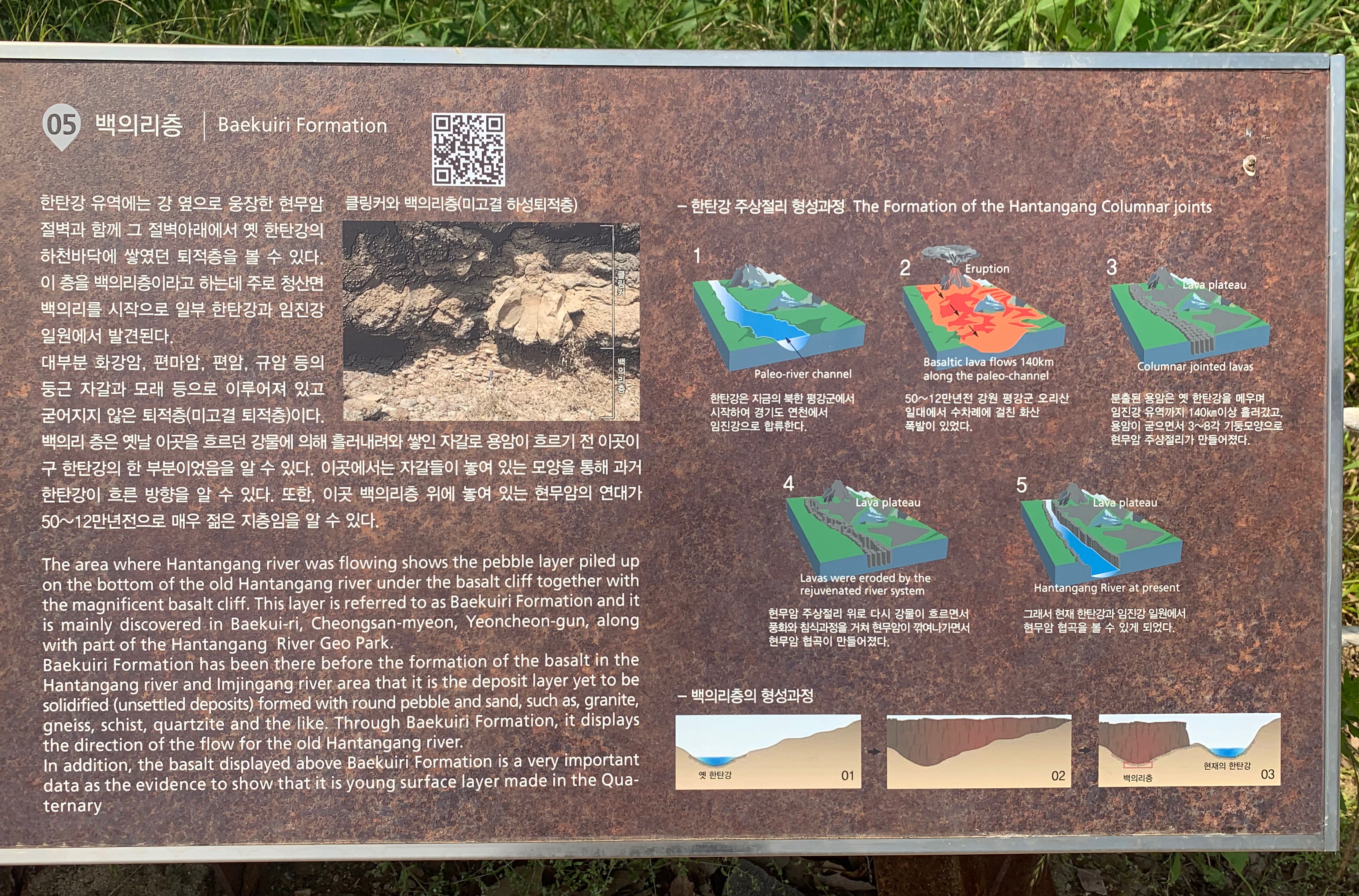이한용관장님 : 연천지역에서는 20~30m 현무암 주상절리 절벽 아래에 아직 암석화 되지 않은 퇴적층이 분포하는데, 이러한 퇴적층을 백의리층이라 부른답니다.