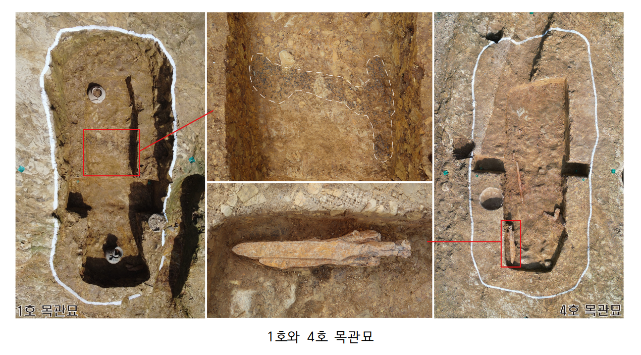 - 4호 목관묘는 묘광의 규모가 가장 큰 목관묘임. 충전토 내에 호류가 부장되어 있으며 발치로 추정되는 서단벽 가장자리에 철모 3점이, 중앙부에 철촉과 철검, 철부가 출토되었음. 중앙부에서 수정제 다면목 2점이 출토되었음.