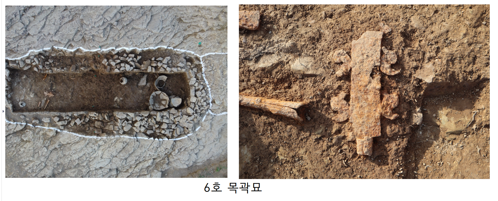 - 7호 목곽묘는 조사지역 내 가장 대형의 목곽묘로 도굴이 전혀 이루어지지 않았음. 북서단벽부에는 바닥석이 깔리지 않았고 토기류 위주의 부장공간이 마련되어 있음.