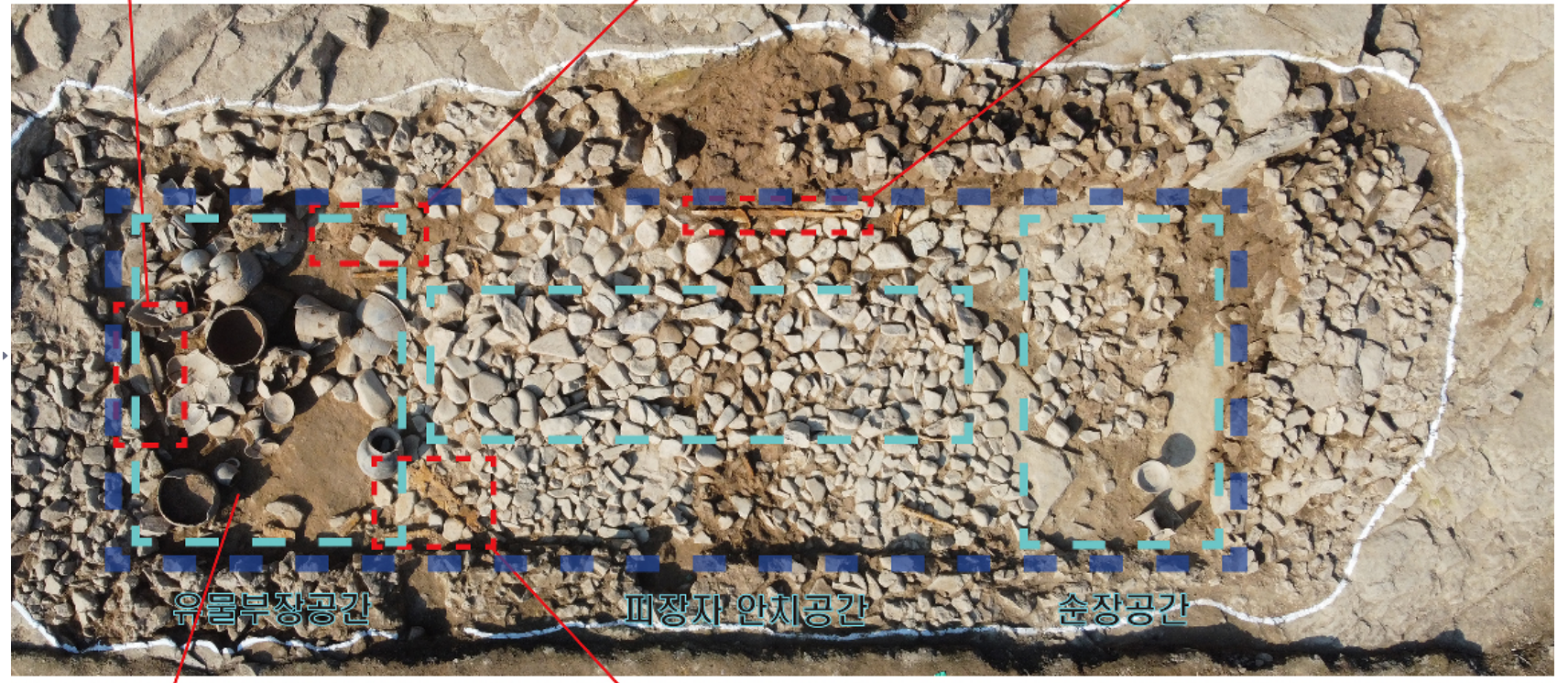 남동단벽부에는 한쪽으로 치우쳐 고배 2점만이 주장되어 있으며 바닥은 부정형으로 깔아 놓은 양상이 석곽묘에서 확인되는 순장공간의 양상과 유사한 양상을 보이고 있어 순장공간일 가능성이 매우 높을 것으로 파악됨.