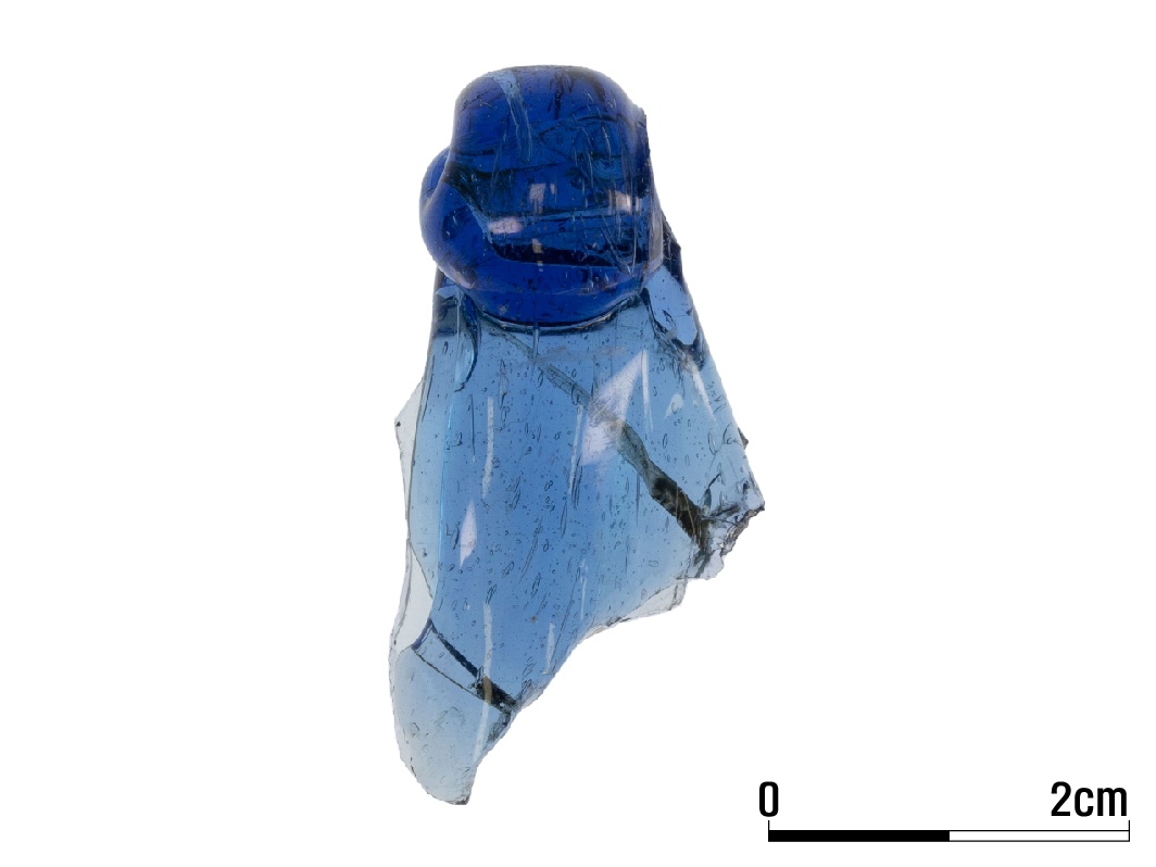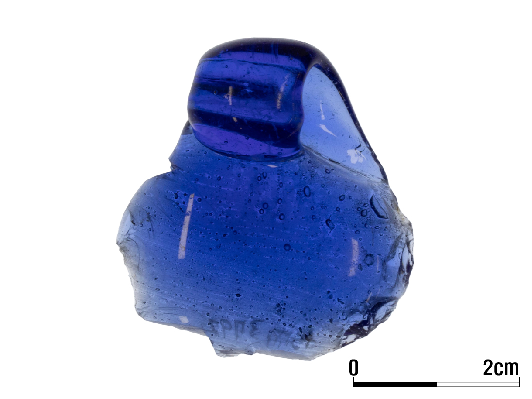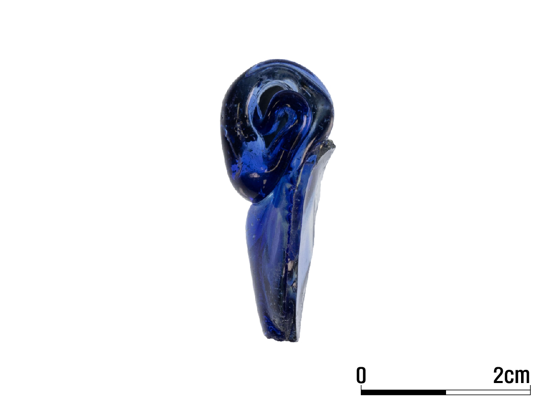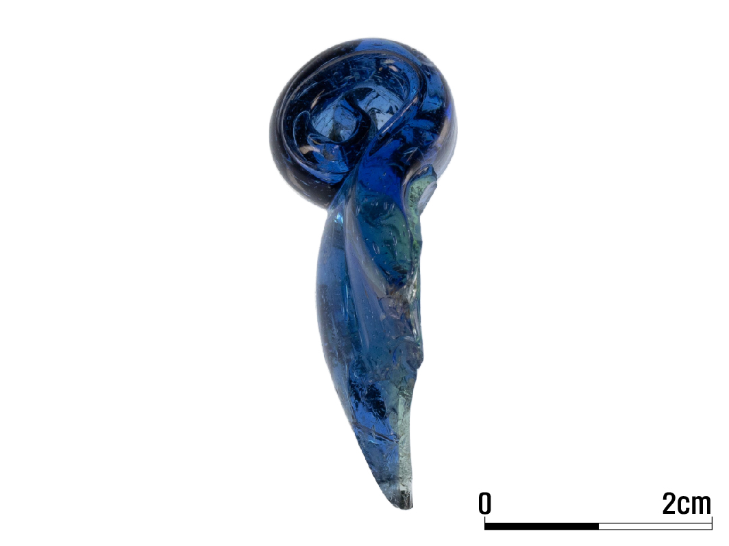 유리제품은 그 청자 주변에서는 이른바 ‘로만글라스’라 칭하는 둥글게 말린 장식을 단 감청색 조각 형태로 발견됐다. 아라가야 권역에서는 최초로 확인한 이른바 로만글라스 쪼가리였다.