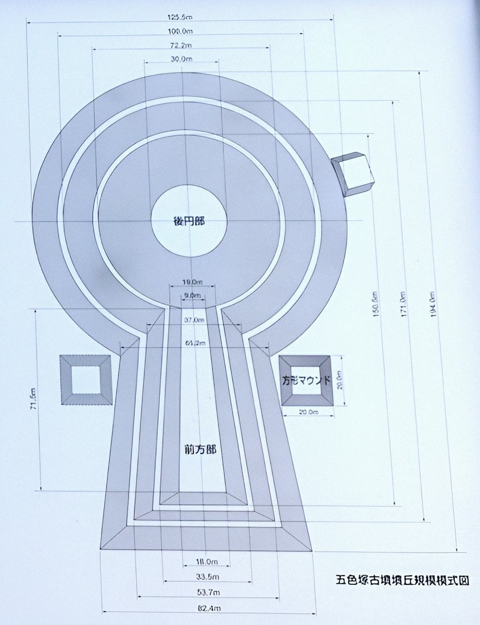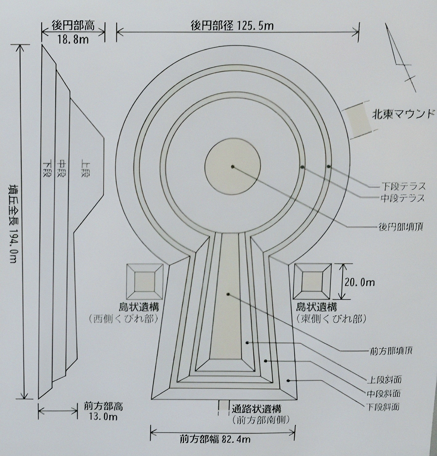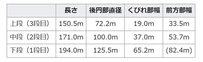 무덤 전체 길이는 194m. 자세한 분구 규모는 아래와 같다. (괄호 안은 추정치)