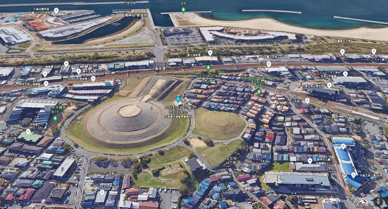 이 무덤을 논할 때 그 장소성을 뺄 수 없다. 다시 말해 명석해협明石海峡을 한 눈에 조망하는 바닷가에 자리잡았으니 그 맞은편 해안에 담로도淡路島를 조망한다.