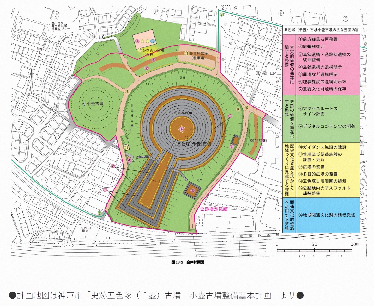 효고현兵庫県에서는 가장 큰 전방후원분으로 고분시대 중기인 4세기 말~5세기 초두 등장으로 추정된다. 일본에서는 처음으로 복원정비가 이뤄진 곳이기도 하다.