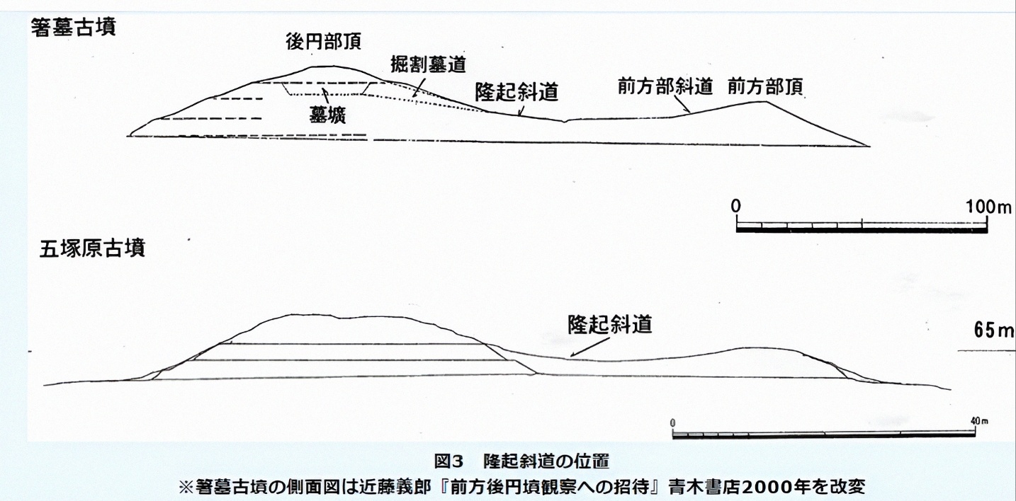 전방부前方部는 남쪽을 향하고 분구墳丘는 흔한 대로 3단으로 지어 만들었다.