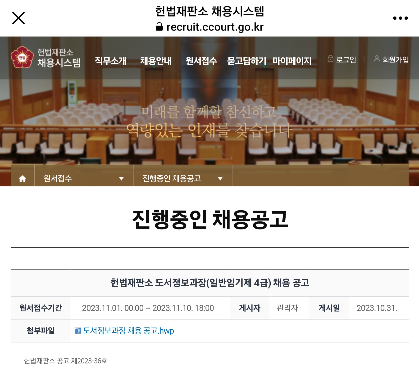헌법재판소 공고 제2023-36호 헌법재판소 도서정보과장(일반임기제 4급) 채용 공고 문화와 예술의 마을에 자리한 우리나라 최고의 헌법재판기관인 헌법재판소에서 아래와 같이 도서정보과장을