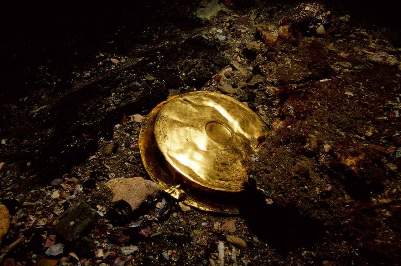 A golden phial found in Thonis-Heracleion. Phials were shallow dishes used throughout the hellenistic world for drinking and pouring libations. ©Franck Goddio/Hilti Foundation, photo: Christoph Gerigk. 토니스-헤라클레이온에서 발견된 황금 약병. 약병은 헬레니즘 세계 전체에서 신주를 마시고 붓는 데 사용하는 얕은 접시였다.