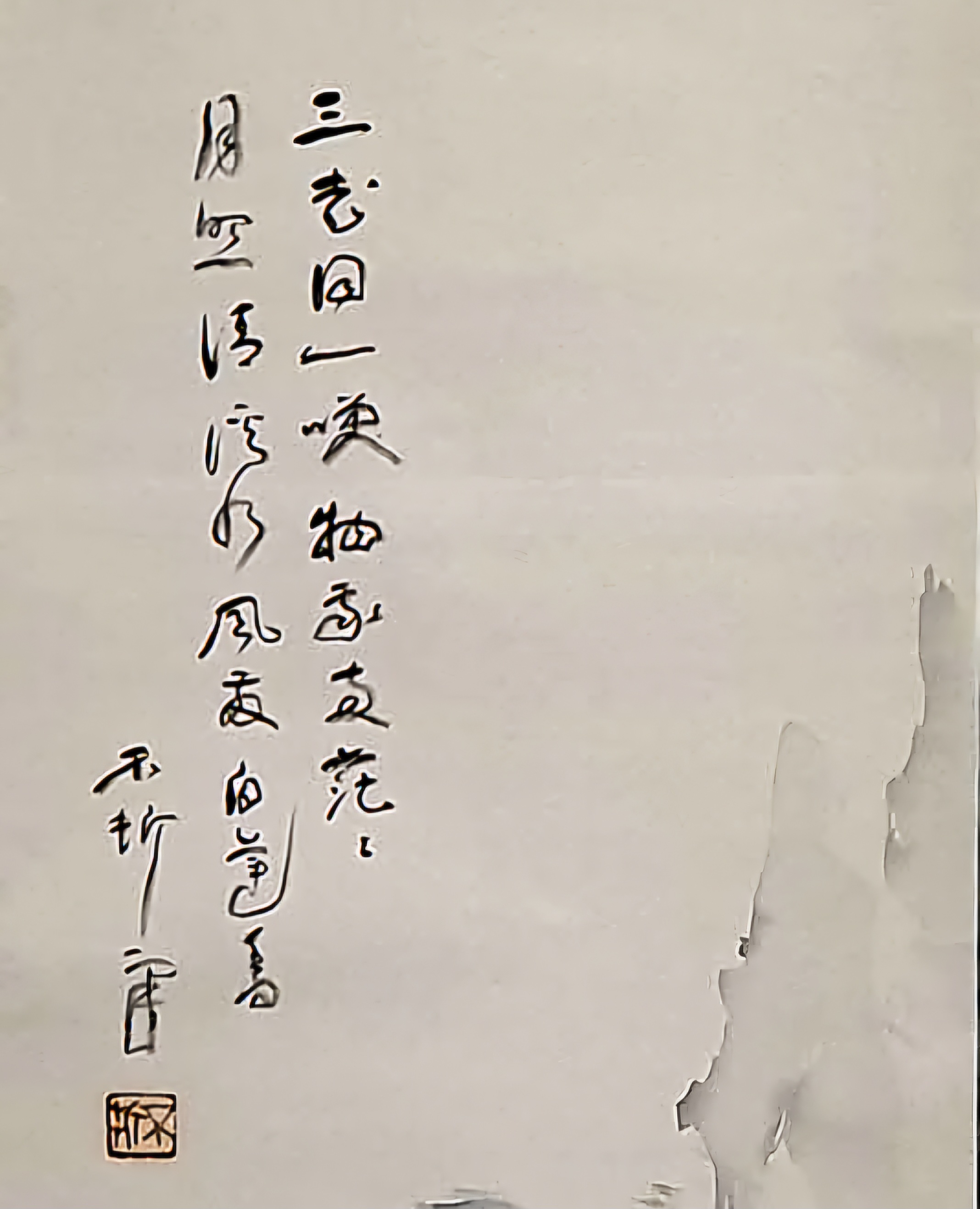 엷게 우려낸 먹으로 올린 산 아래 소나무 한 가지, 그 옆에 셋이 서 있다.