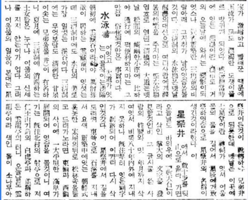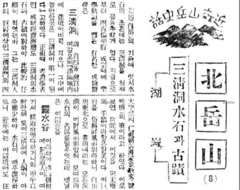 《조선일보》 1935 년 9월 27일 5면에 당대의 文士 호암 문일평이 북악산에 대한 글을 썼는데 부제가 삼청동 수석水石과 고적이다.