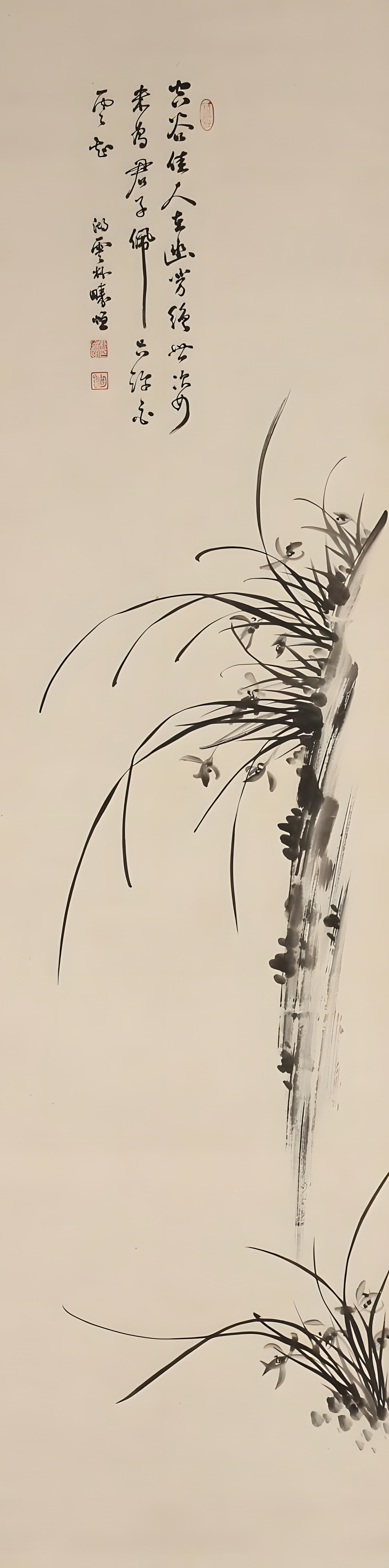 난 이파리를 친 각도를 보나 괴석도 아니요 땅도 아닌 언덕배기에 앉힌 품을 보나 호운의 난임엔 틀림없는데, 그의 다른 작품보단 훨씬 깔끔하고 유려하다. 먹의 짙고 옅음을 다루는 솜씨도 능숙하고 화제글씨도 물 흐르듯 거침없다.